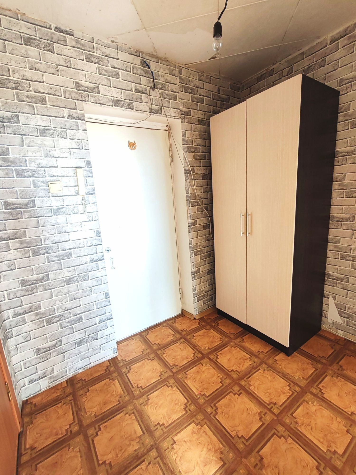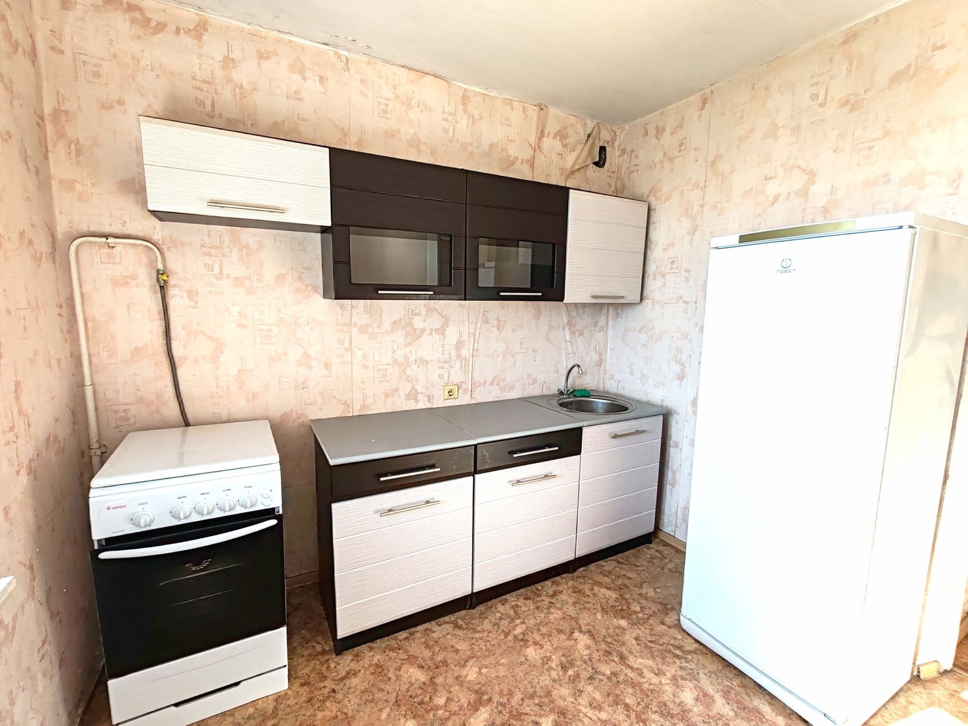 В квартире остаётся кухонный гарнитур, кровать, шкаф, тумбы, холодильник, стиральная машинка автомат.