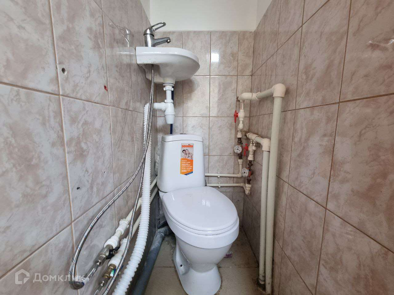 Выполнен ремонт: покрашены стены, на полу кафель, окна пластиковые. Оборудован санузел.