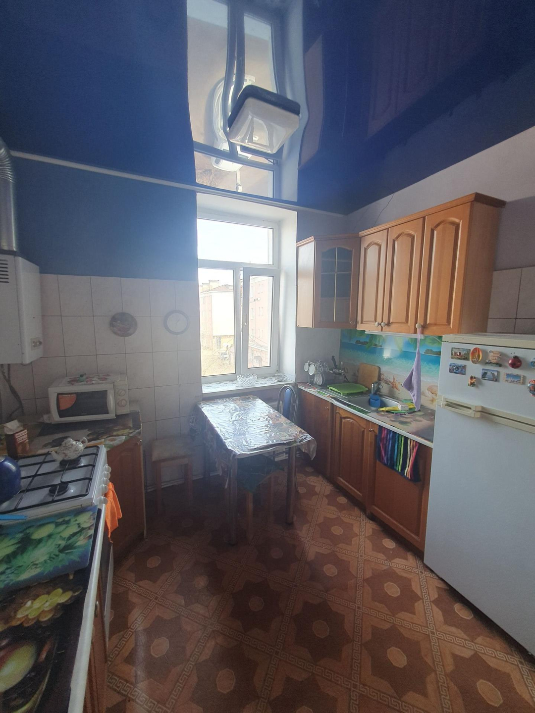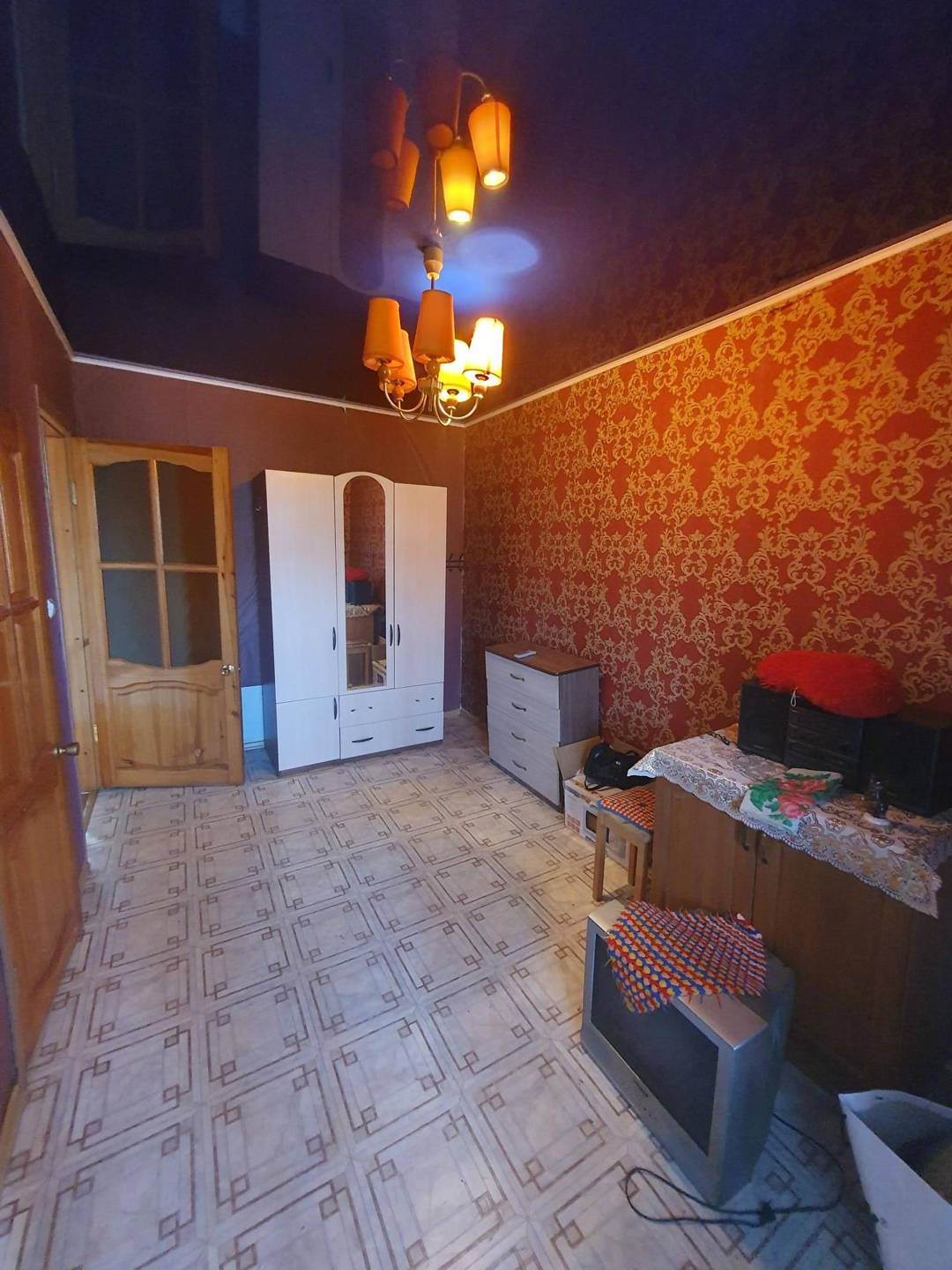 С мебелью и техникой: телевизор, холодильник, микроволновка, диван, кровать, шкаф купе, кухонный гарнитур.