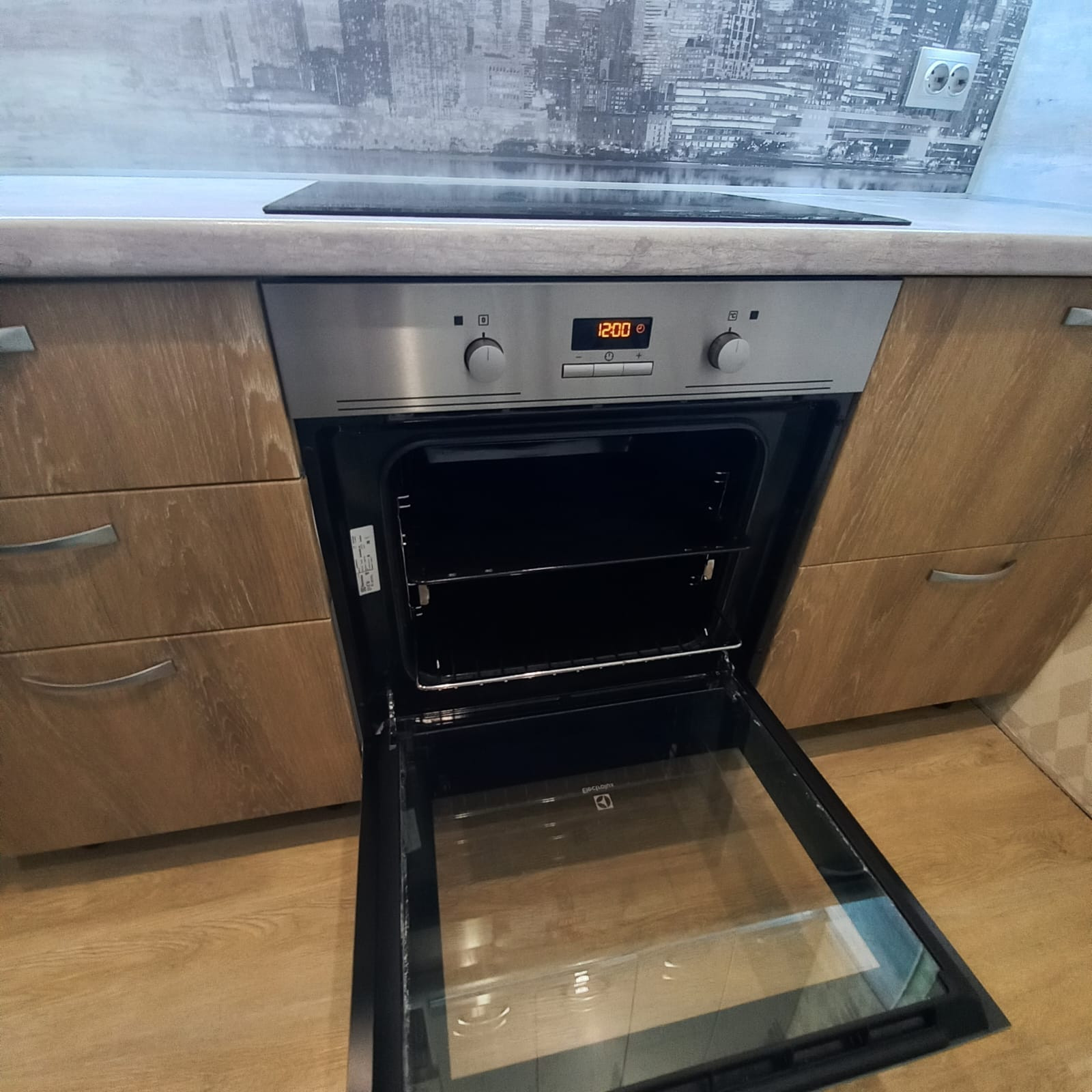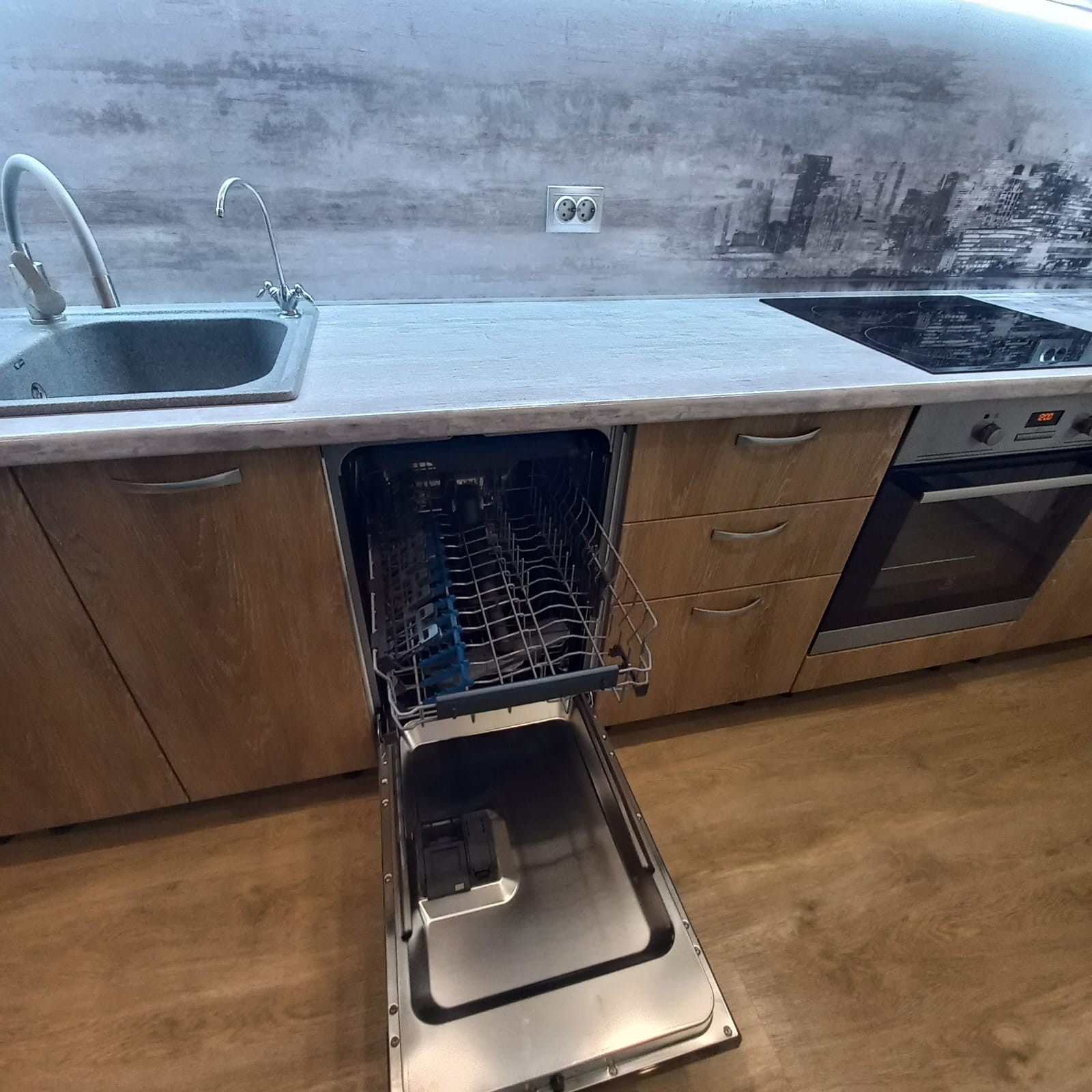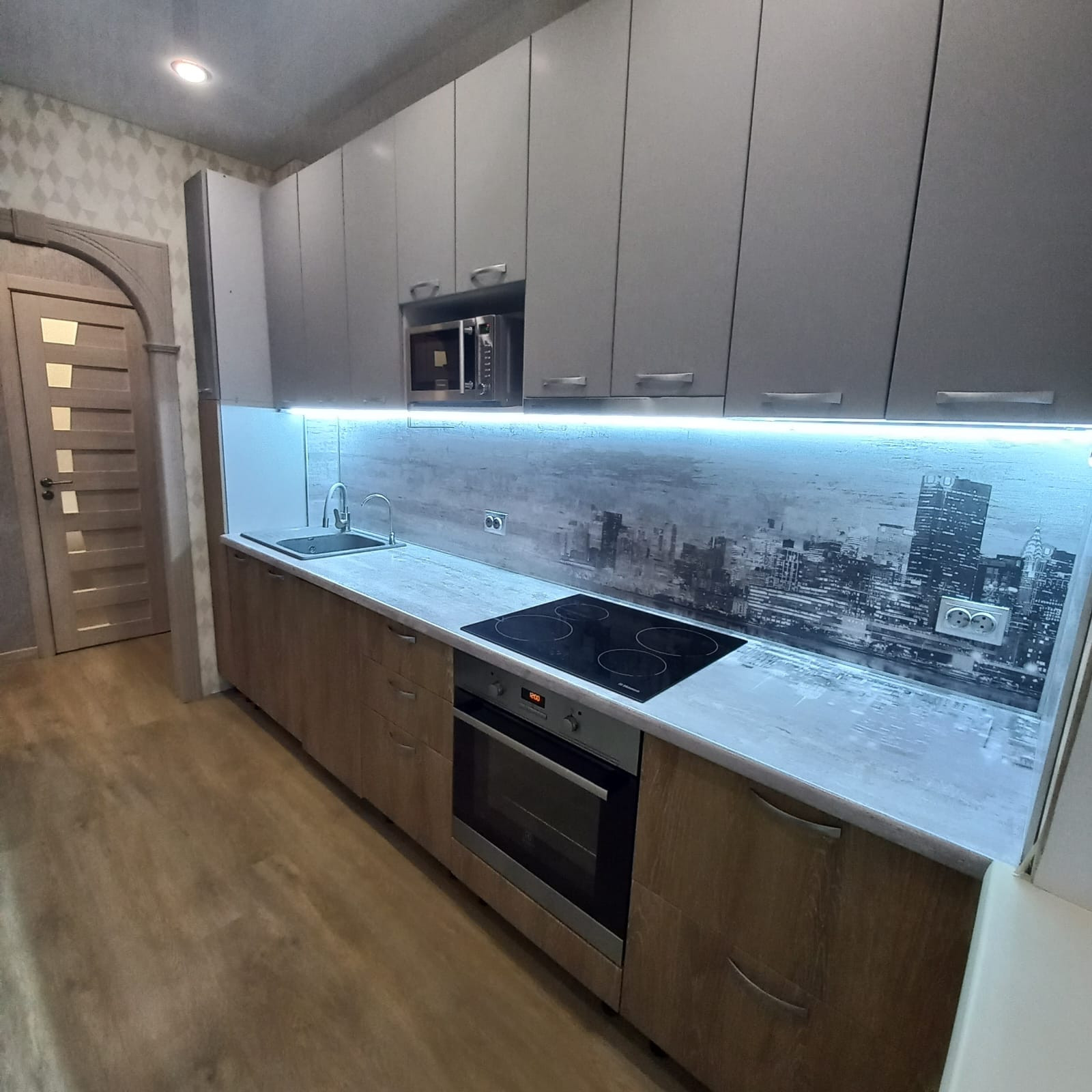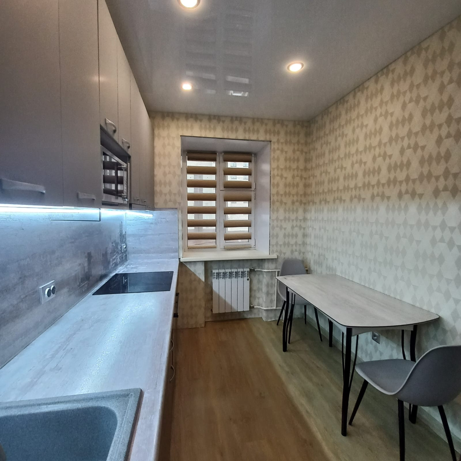 Кухня оснащена встроенным гарнитуром с индукционной плитой (Hansa), микроволновой печью, посудомоечной машиной (Electrolux) холодильном (LG), так же есть фильтр для воды, стол, стулья. Верхние шкафы гарнитура высотой 90 см, что позволяет рационально использовать пространство.