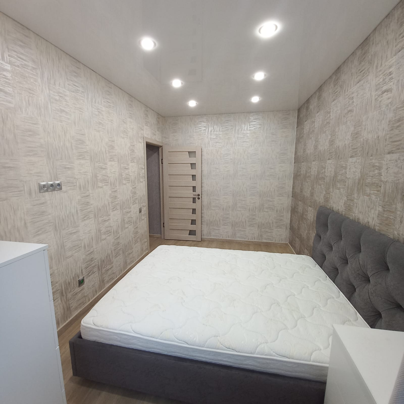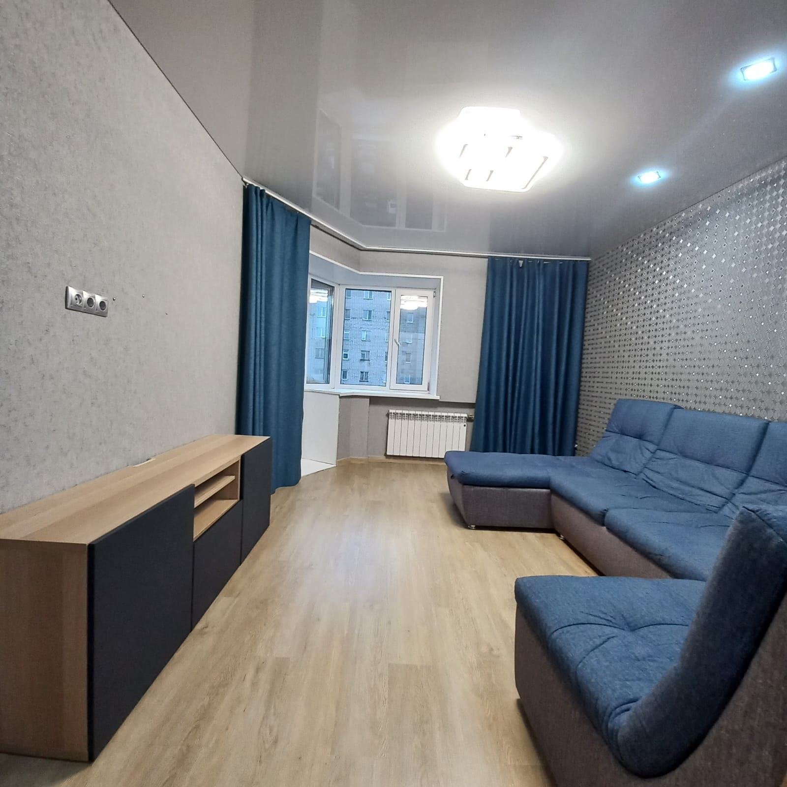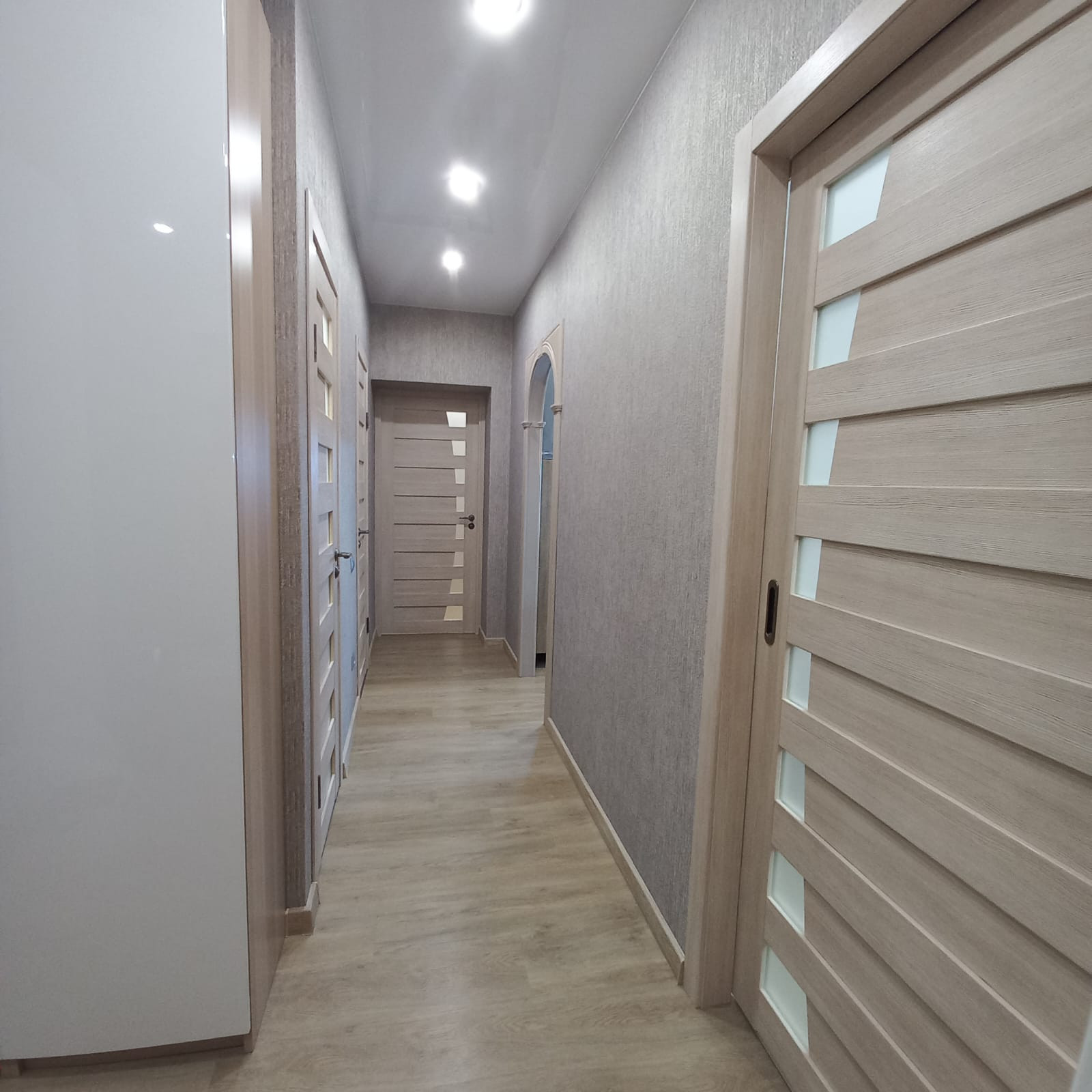 В квартире сделан капитальный ремонт: залиты полы (стяжка пола толщиной 17 см), выравнены стены, заменена проводка (провода ГОСТ, проложены отдельные вводы для энергоёмких потребителей), заменены батареи на дорогие, биметаллические, новая сантехника. Во всех комнатах установлены натяжные потолки с точечными светильниками, в зале люстра с пультом управления, наклеены обои, на полу кварц винил. Ванная и туалет отделаны плиткой, трубы стояков и подводы батарей утоплены в стены. Установлена новая, дверь, двойная шумоизоляция, с магнитными прижимами.