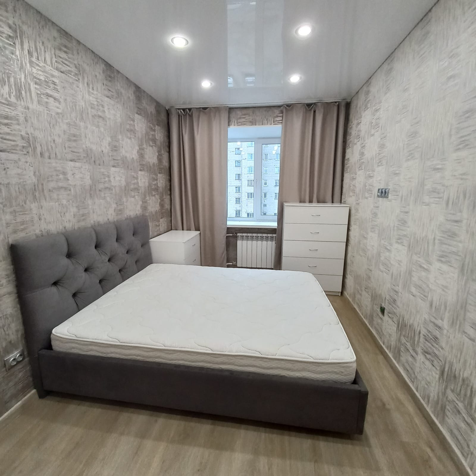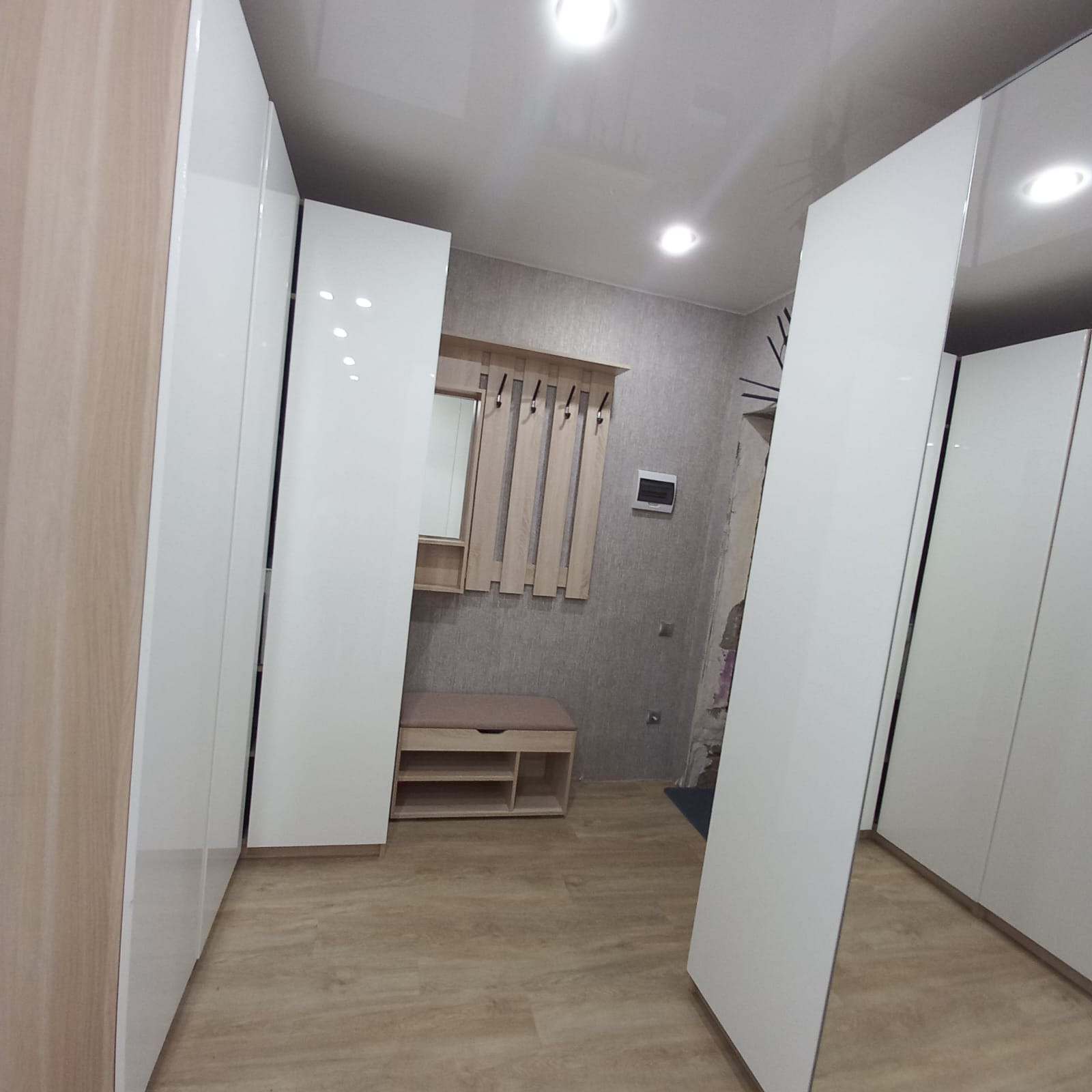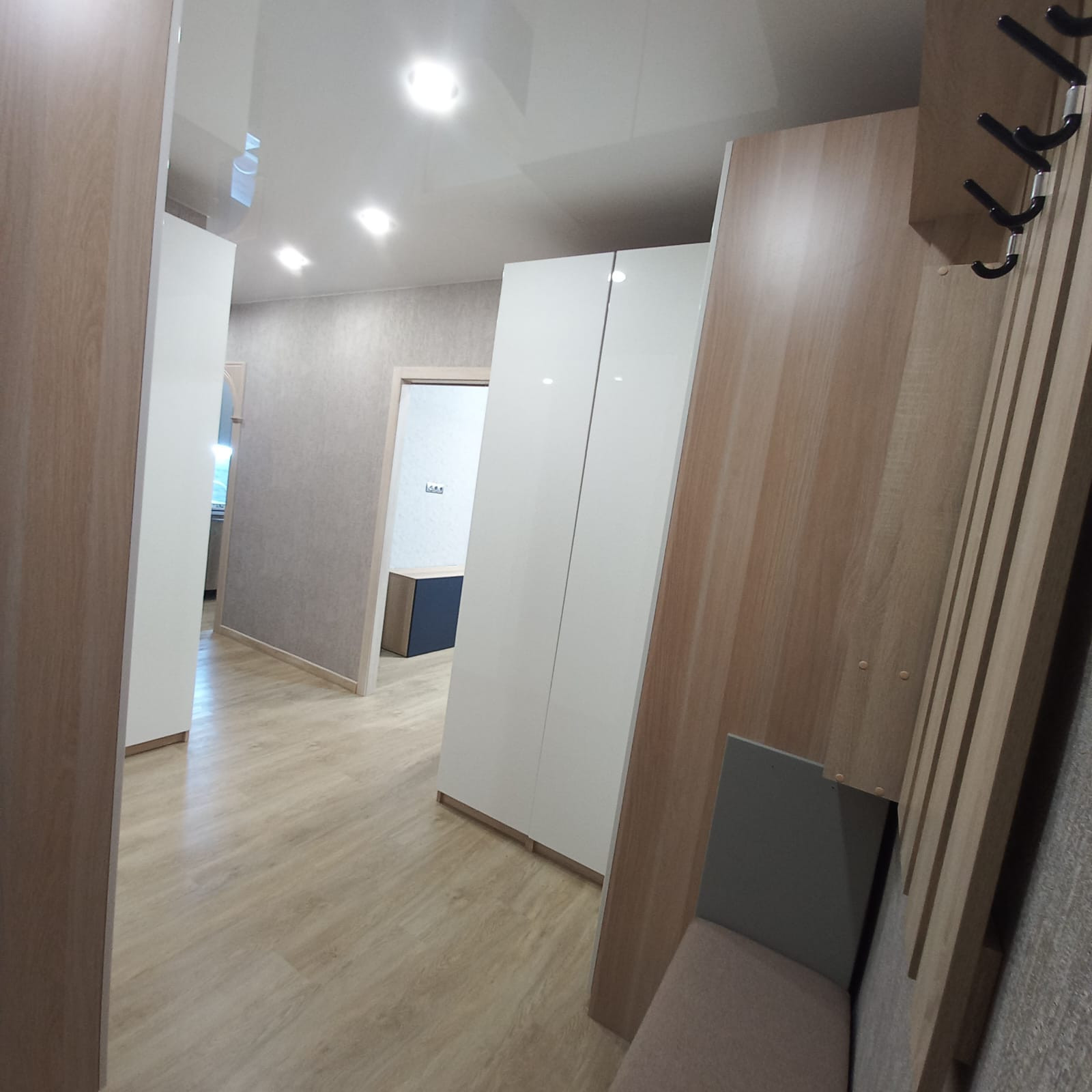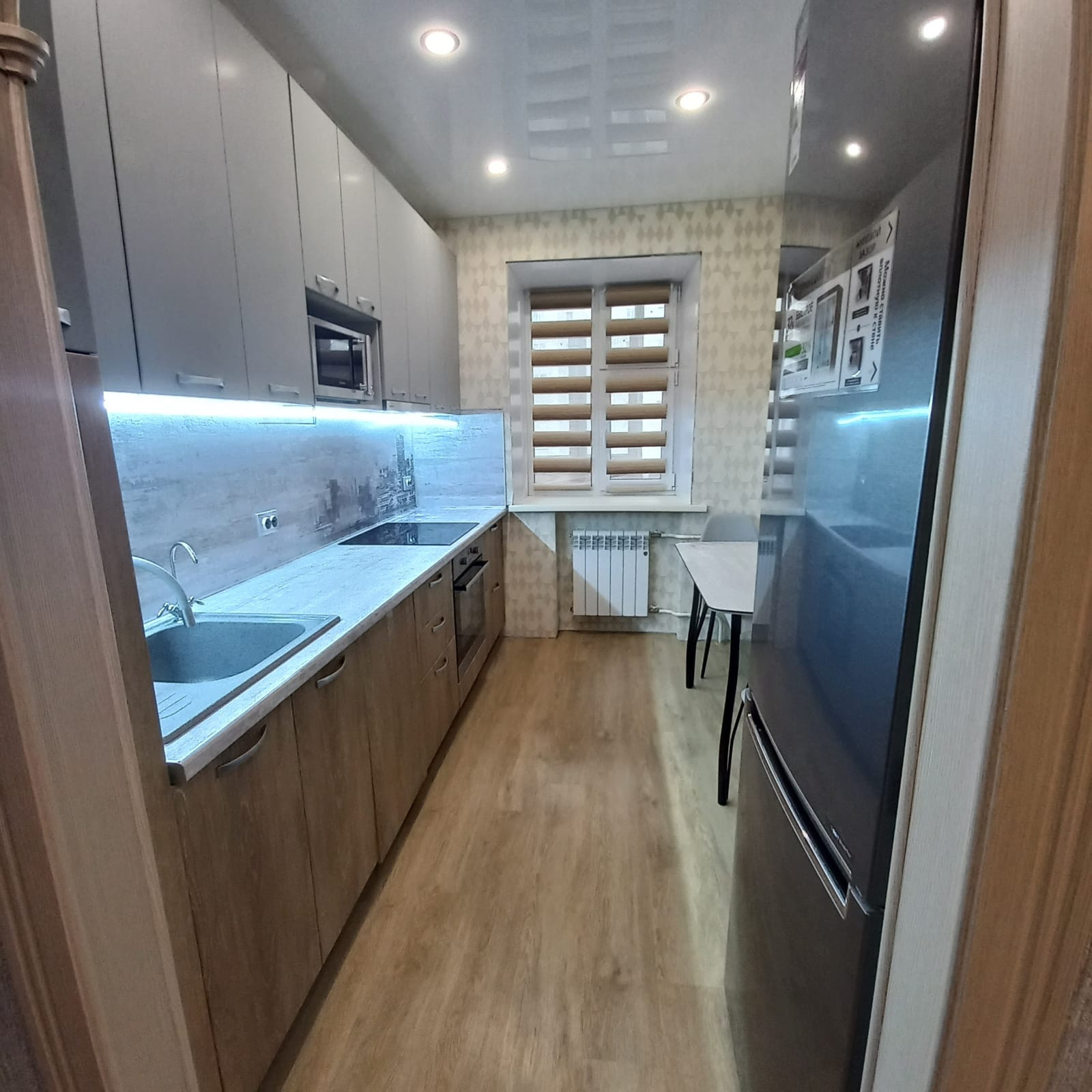 В квартире сделан капитальный ремонт: залиты полы (стяжка пола толщиной 17 см), выравнены стены, заменена проводка (провода ГОСТ, проложены отдельные вводы для энергоёмких потребителей), заменены батареи на дорогие, биметаллические, новая сантехника. Во всех комнатах установлены натяжные потолки с точечными светильниками, в зале люстра с пультом управления, наклеены обои, на полу кварц винил. Ванная и туалет отделаны плиткой, трубы стояков и подводы батарей утоплены в стены. Установлена новая, дверь, двойная шумоизоляция, с магнитными прижимами.