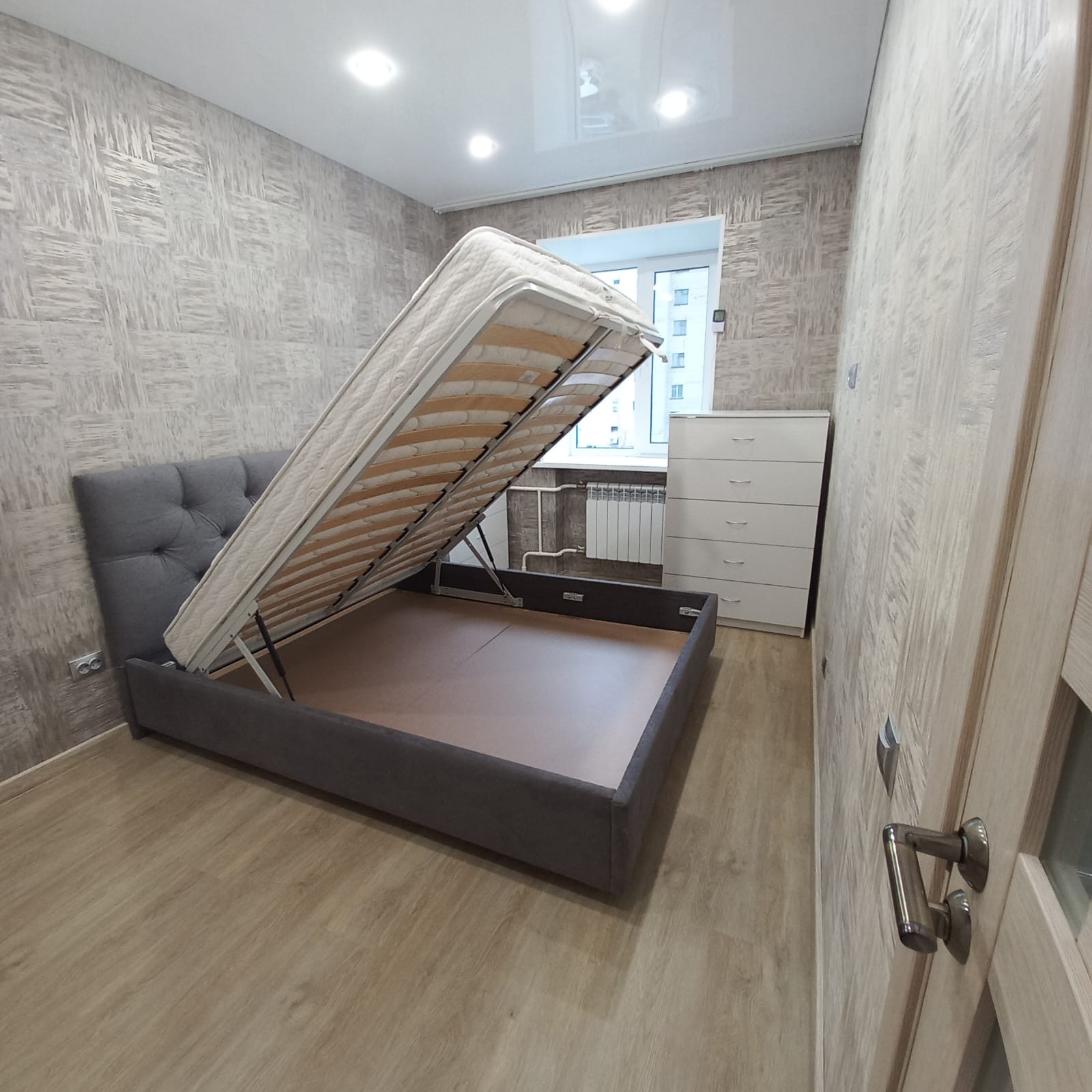 В спальне кровать с подъемным механизмом и матрасом Аскона, два комода.