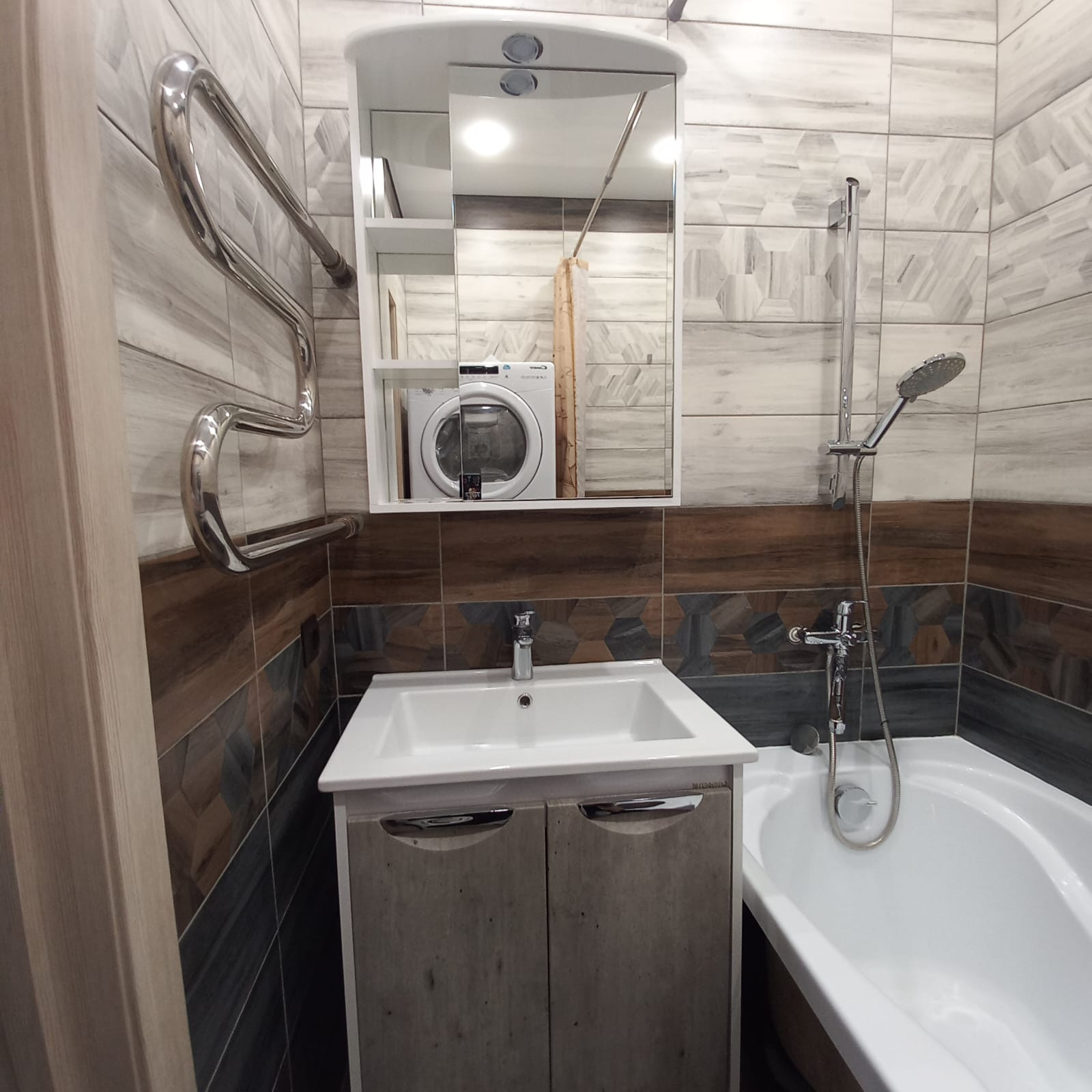 В ванной комнате установлены стиральная (LG) и сушильная машины (Candy).