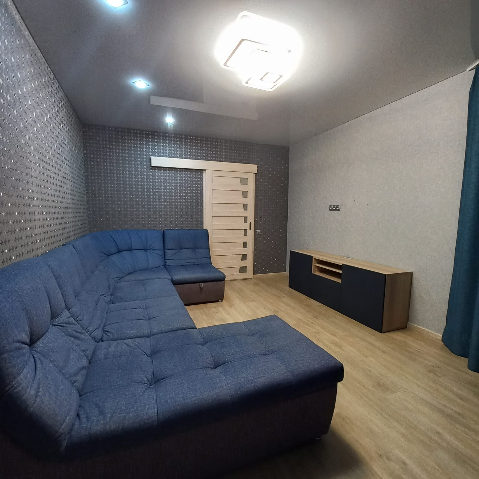 В зале большой трёхметровый диван, тумба TV Икеа. Есть турник для занятий спортом.