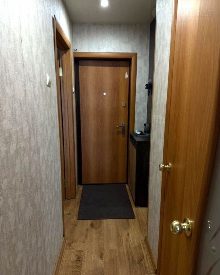 Планировка начинается с прихожей с гардеробной системой хранения, скрытой за зеркальной дверью.