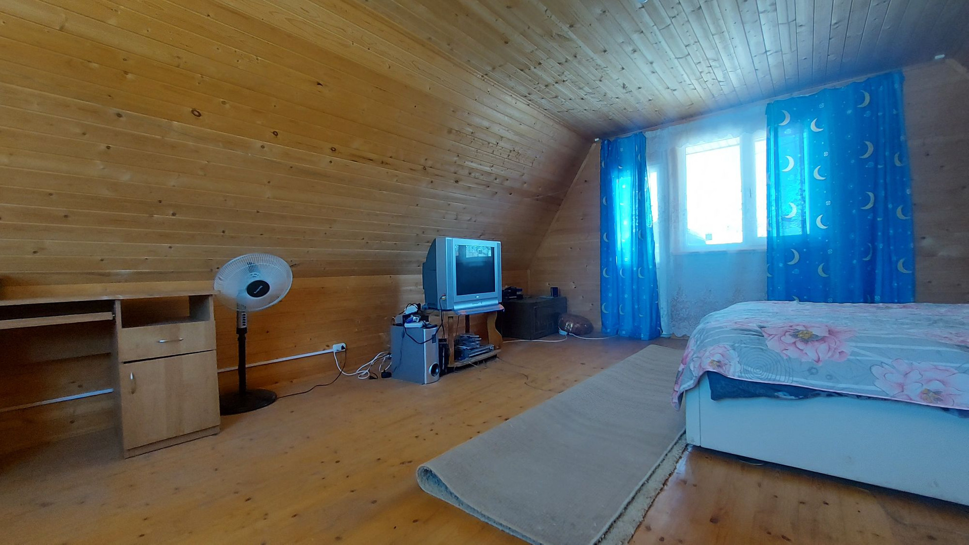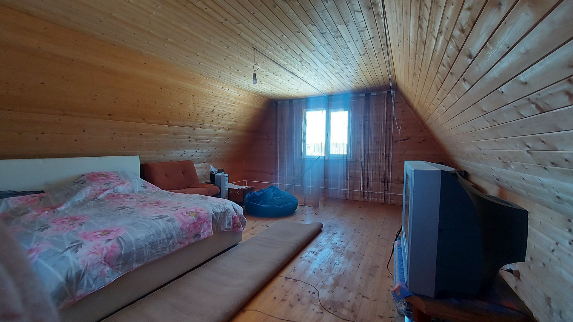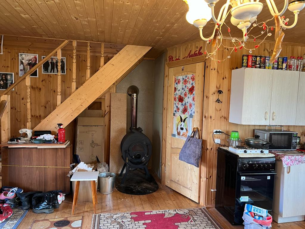 Первый этаж-комната, совмещенный с/у. На второй этаж ведёт удобная лестница. Там, так же одна комната с выходом на балкон.