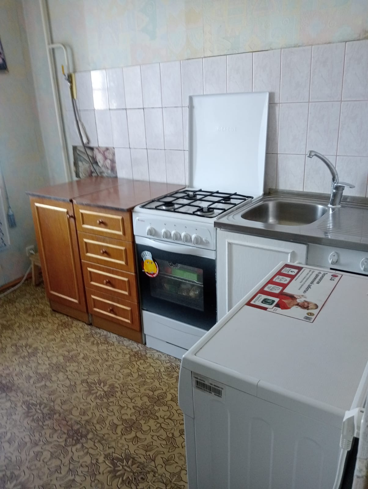 В квартире остается газовая плита, холодильник, стиральная машина, кухонные шкафы, мойка со смесителем