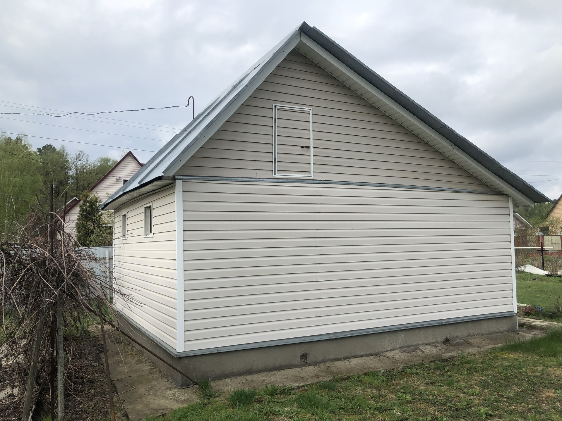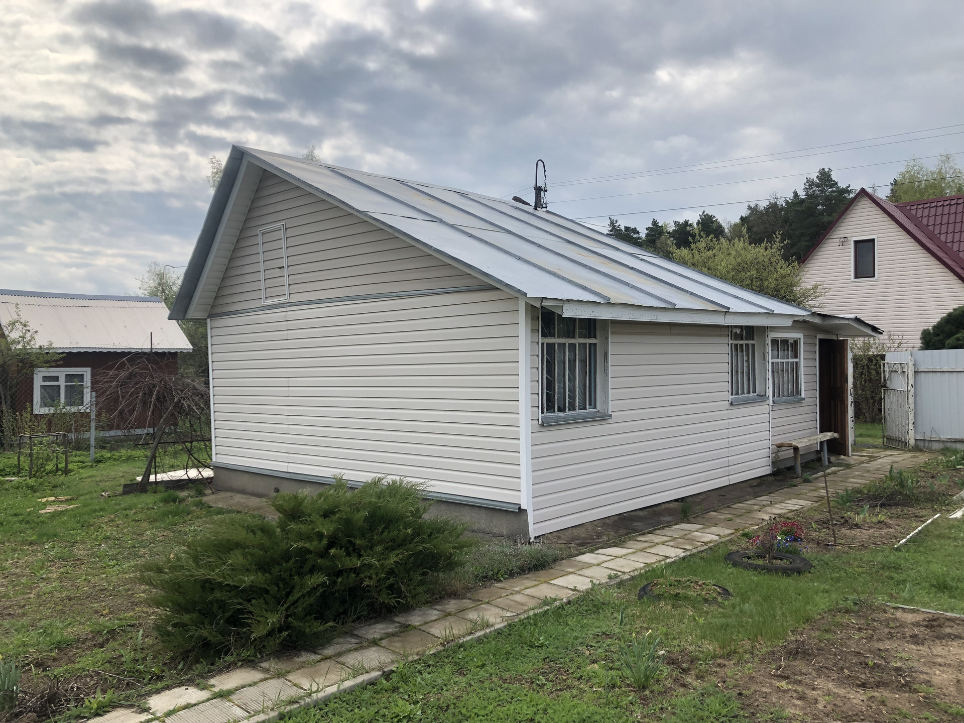 На участке одноэтажный,щитовой дом ~ 30,0 кв.м. Снаружи отделан сайдингом. В доме две комнаты, кухня-терраса.