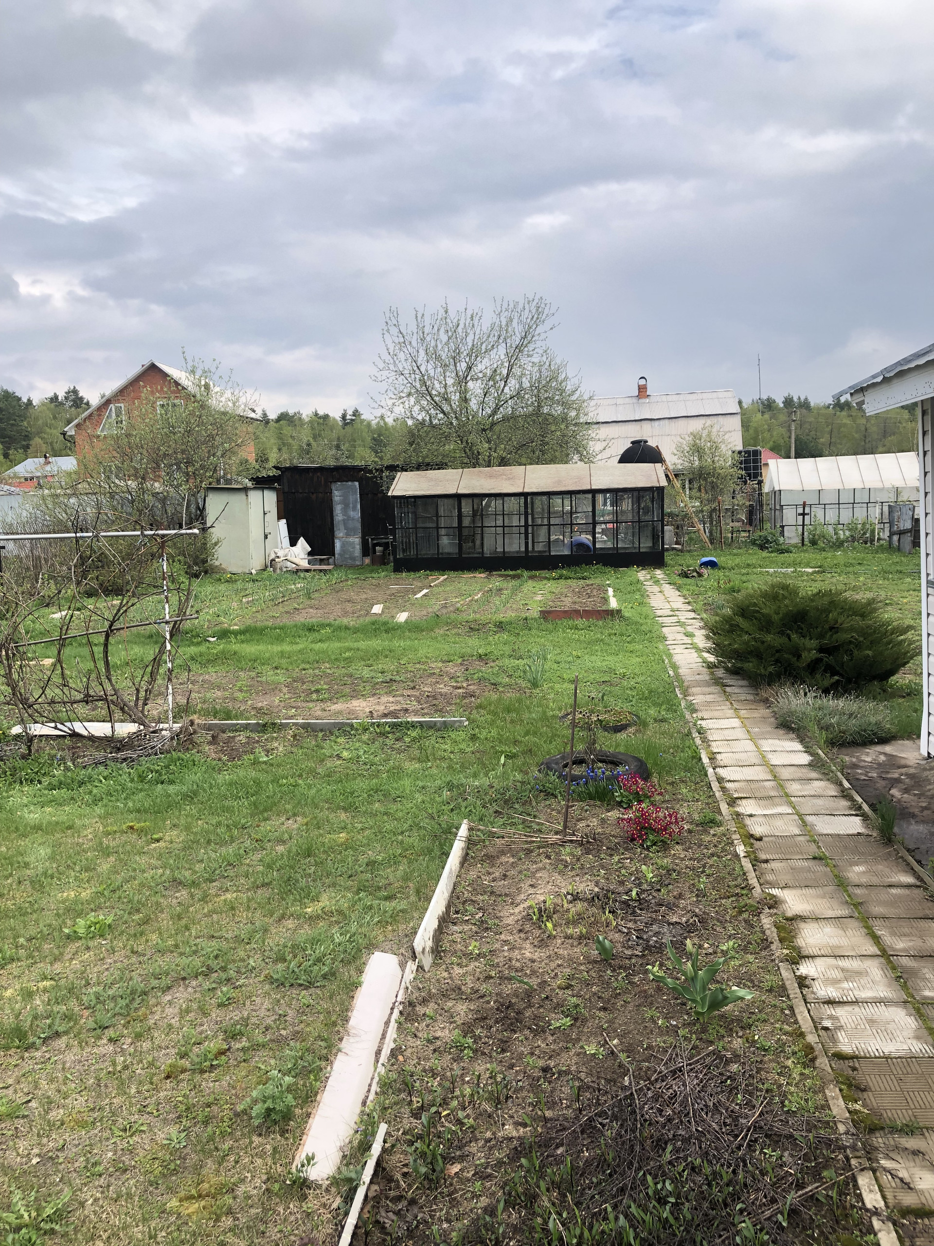 На участке также есть хозблок, бытовка с душем и туалет. Установлена теплица, посажено много декоративных растений, яблони, смородина, слива, виноград. Очень солнечное и плодородное место.
