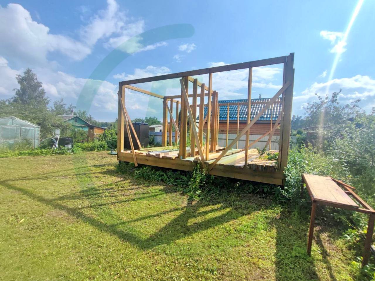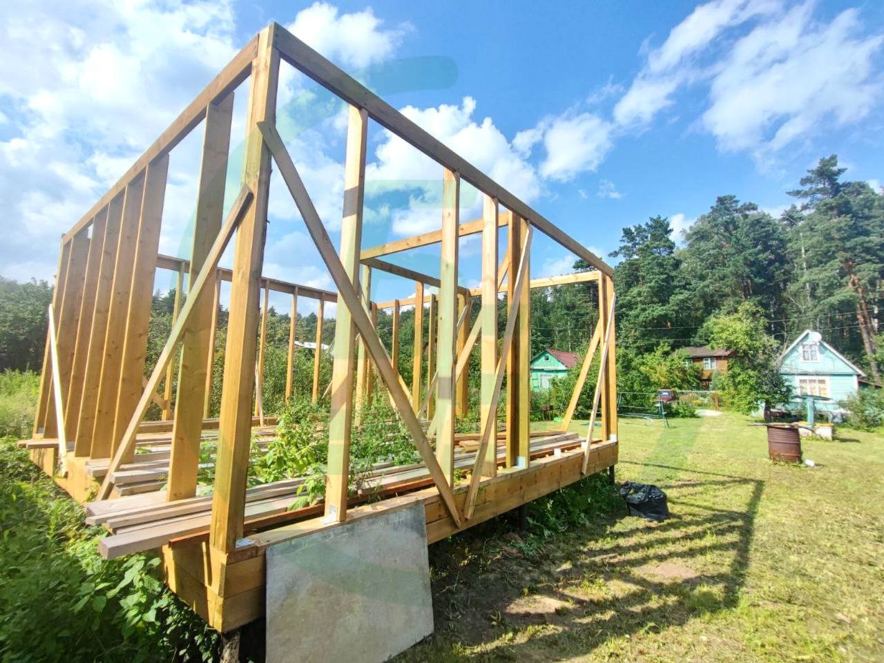 Также начато строительство основного дома, в данный момент установлен силовой каркас первого этажа на винтовые сваи, закуплен утеплитель, который останется новому владельцу. На строящийся дом разработан проект, в котором все этапы строительства подробно описаны (где и какую доску прикрутить, где и какой гвоздь забить). Рядом с новым домом пробурена скважина с питьевой водой, также смонтирован септик. Ещё на участке есть колодец и сезонный водопровод от СНТ, вода из которого используется для полива и технических нужд.