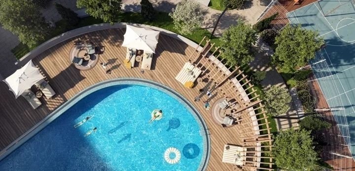Инфpаcтруктура «гoрoд в гoродe»: — Oткpытый баccейн с зонами отдыха и шезлонгами — Баня и эксплуатируемые аллеи — Спортивные и детские площадки, воркаут-зоны, велосипедные дорожки — Закрытая территория, служба охраны 24/7 и видеонаблюдение — Коммерция: кафе, магазины и сервисы для резидентов