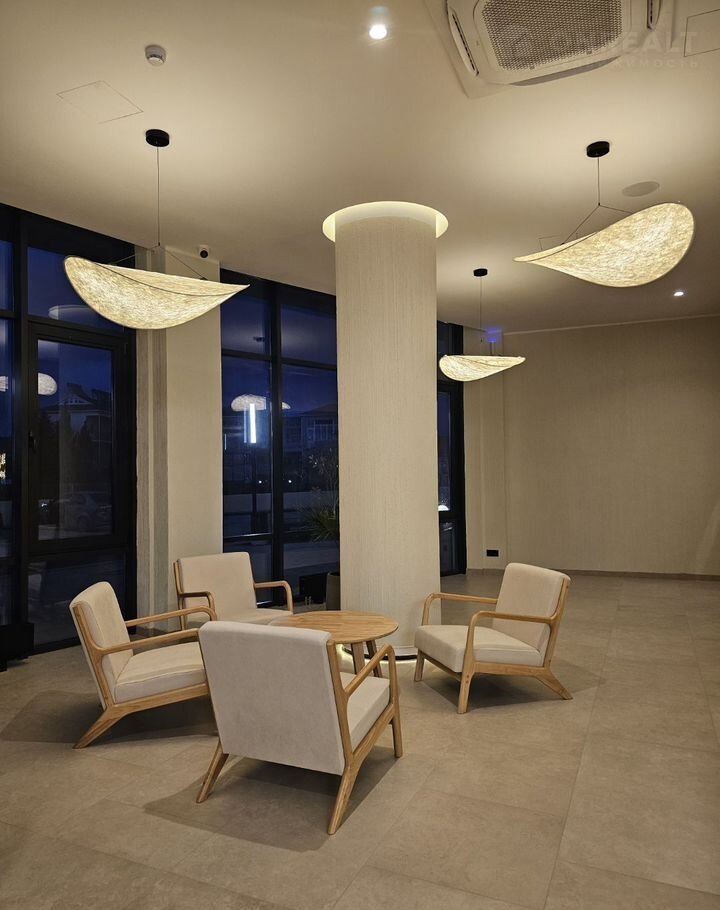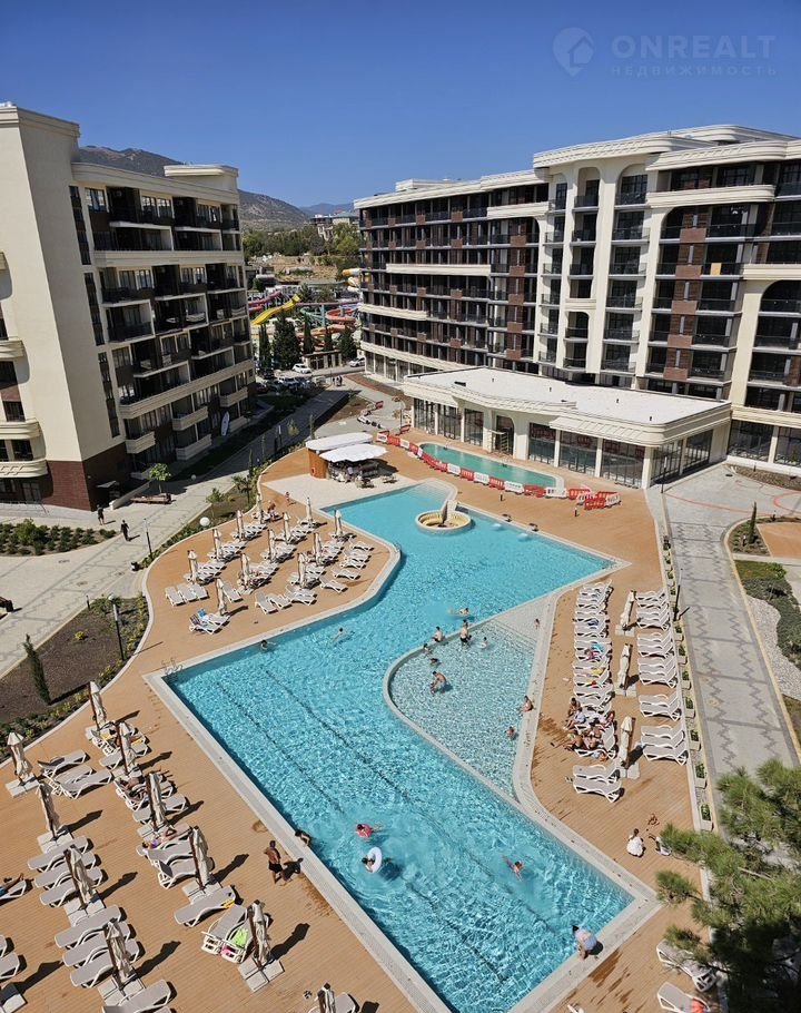 Комплекс находится в первой линии — до пляжа буквально пара минут пешком. Территория закрытая и безопасная, с красивым озеленением и местами для отдыха. Есть большой бассейн, детский бассейн, шезлонги, амфитеатр с просмотрами кинофильмов, детские площадки, игровая комната, тренажёрный зал и бесплатная парковка.