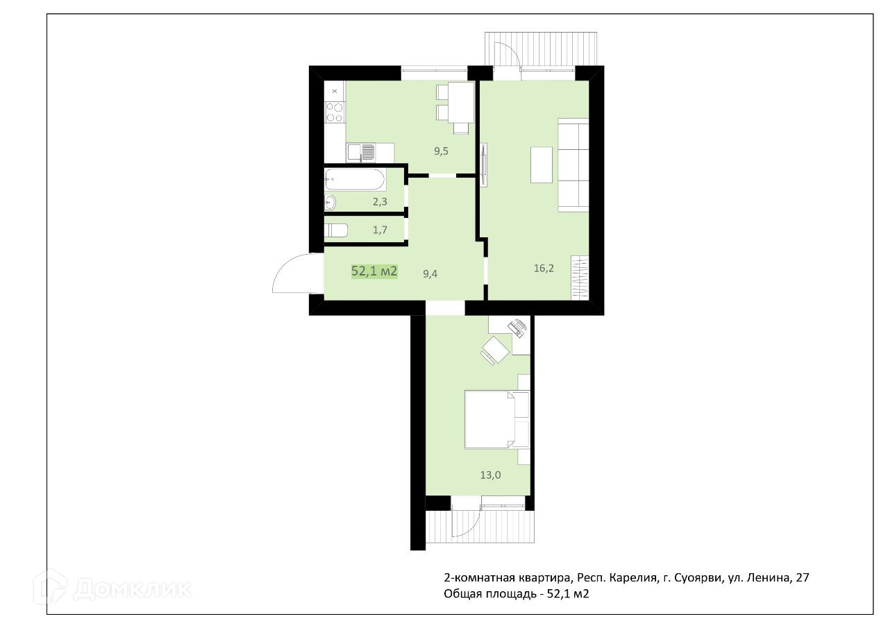 Общая площадь 52.1 м2