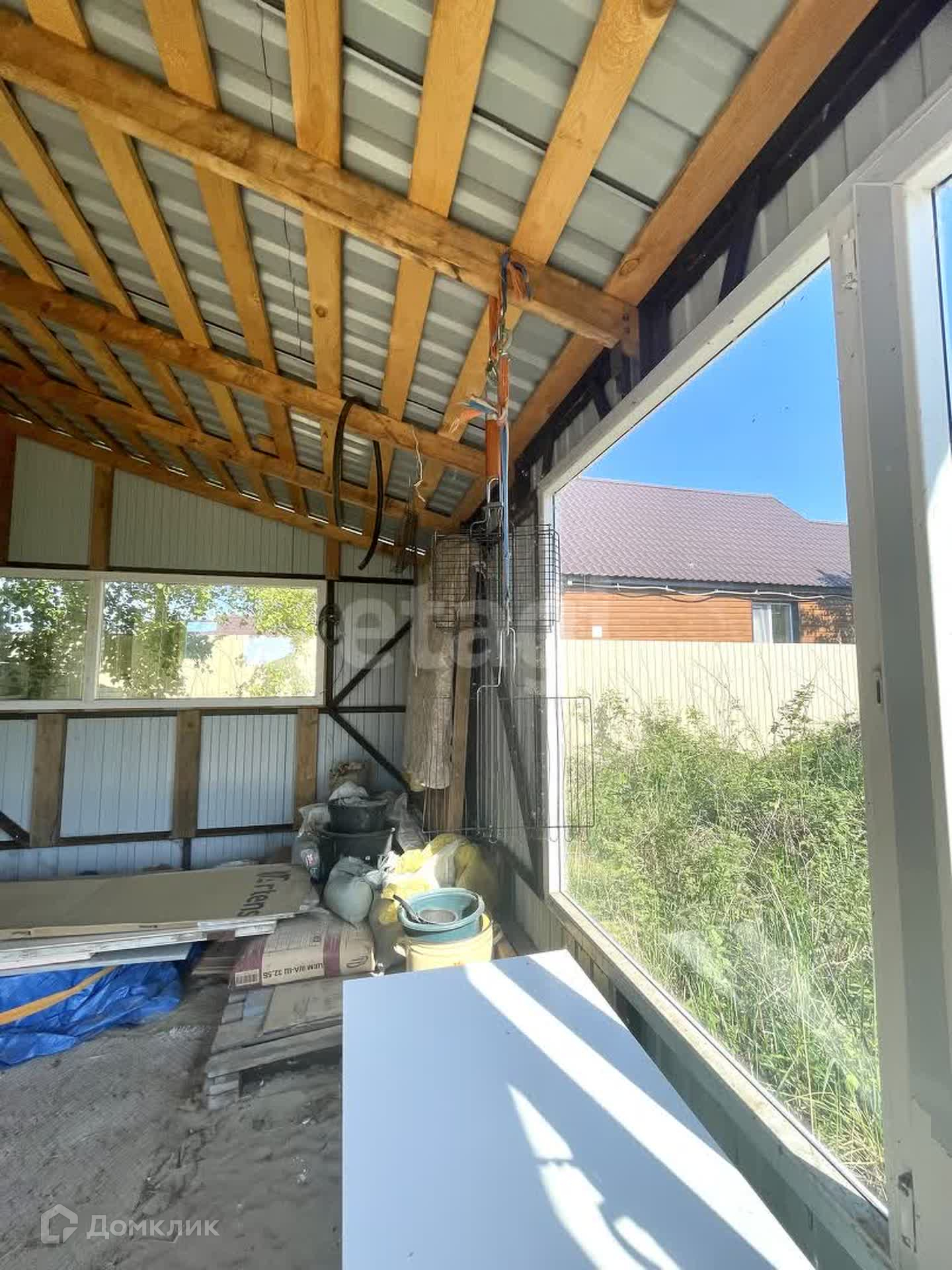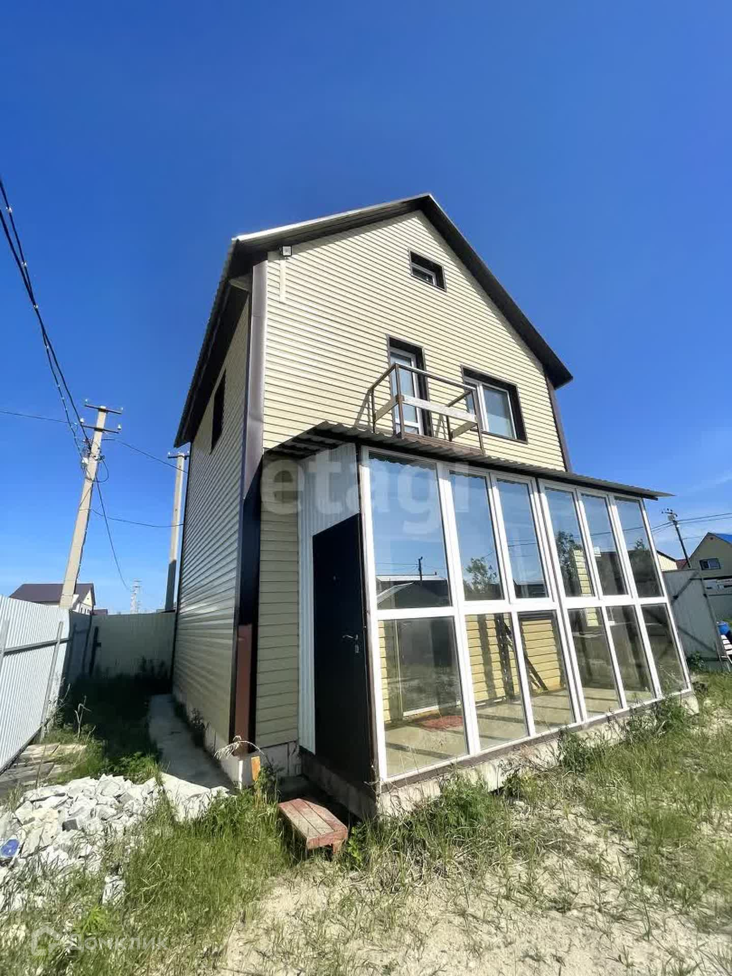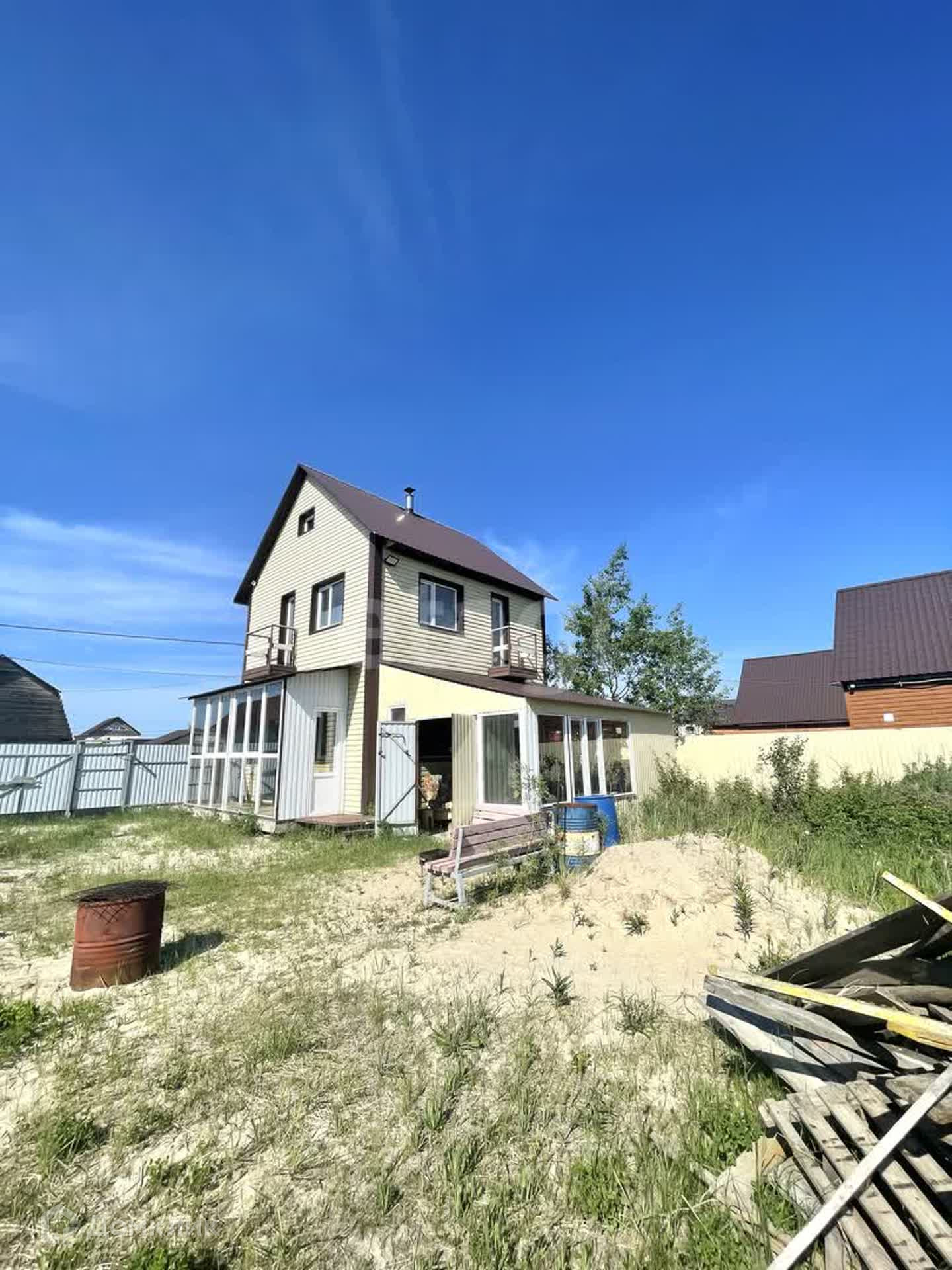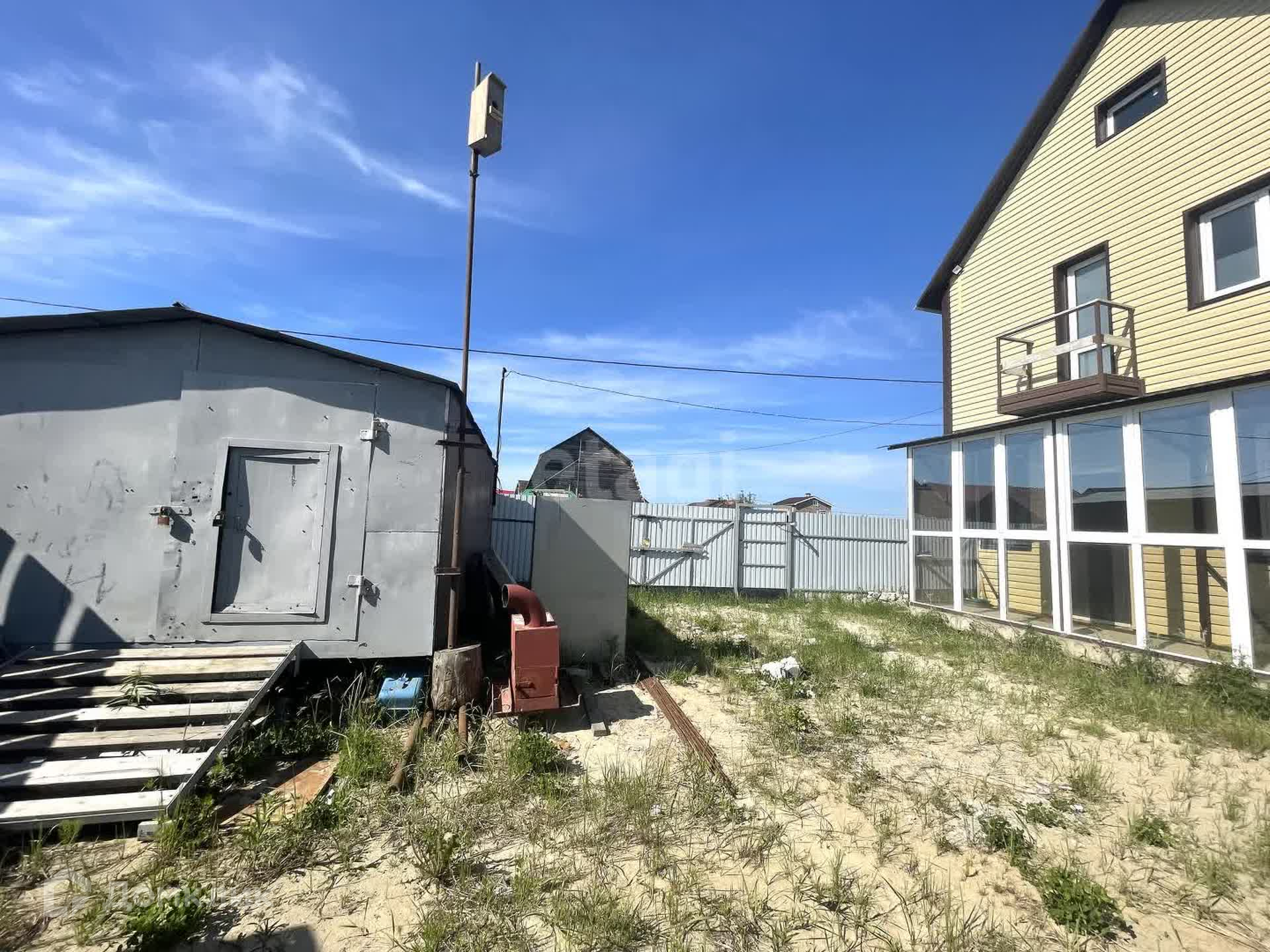 Дом построен из 1 этаж керамзитоблока, 2 этаж пеноблок, фундамент-ленточный, через каждый 1 метр забиты сваи, утеплитель 100, обшит сайдингом, крыша - металлическая. В доме проведено электричество, кабель заведен внутрь здания.