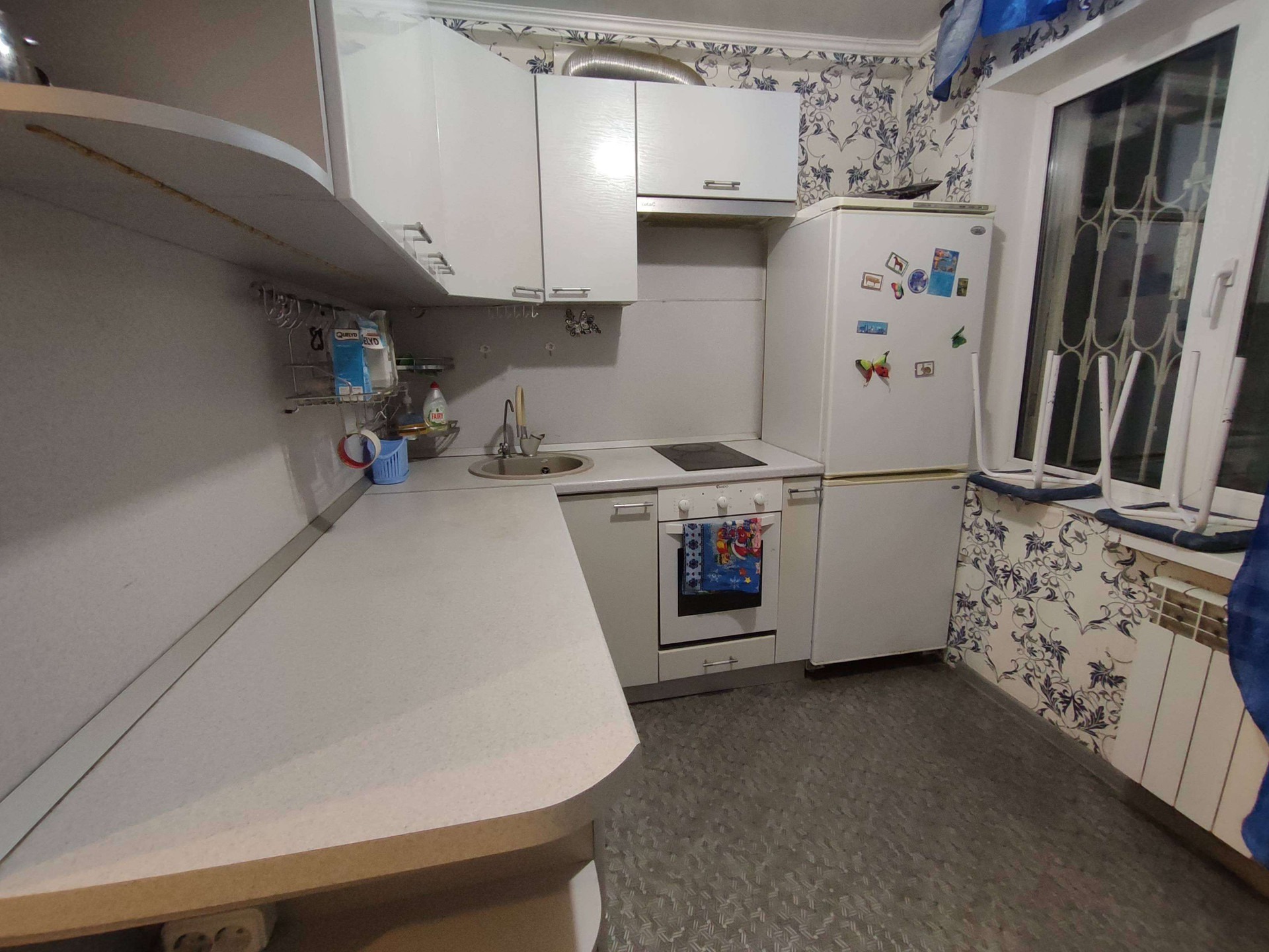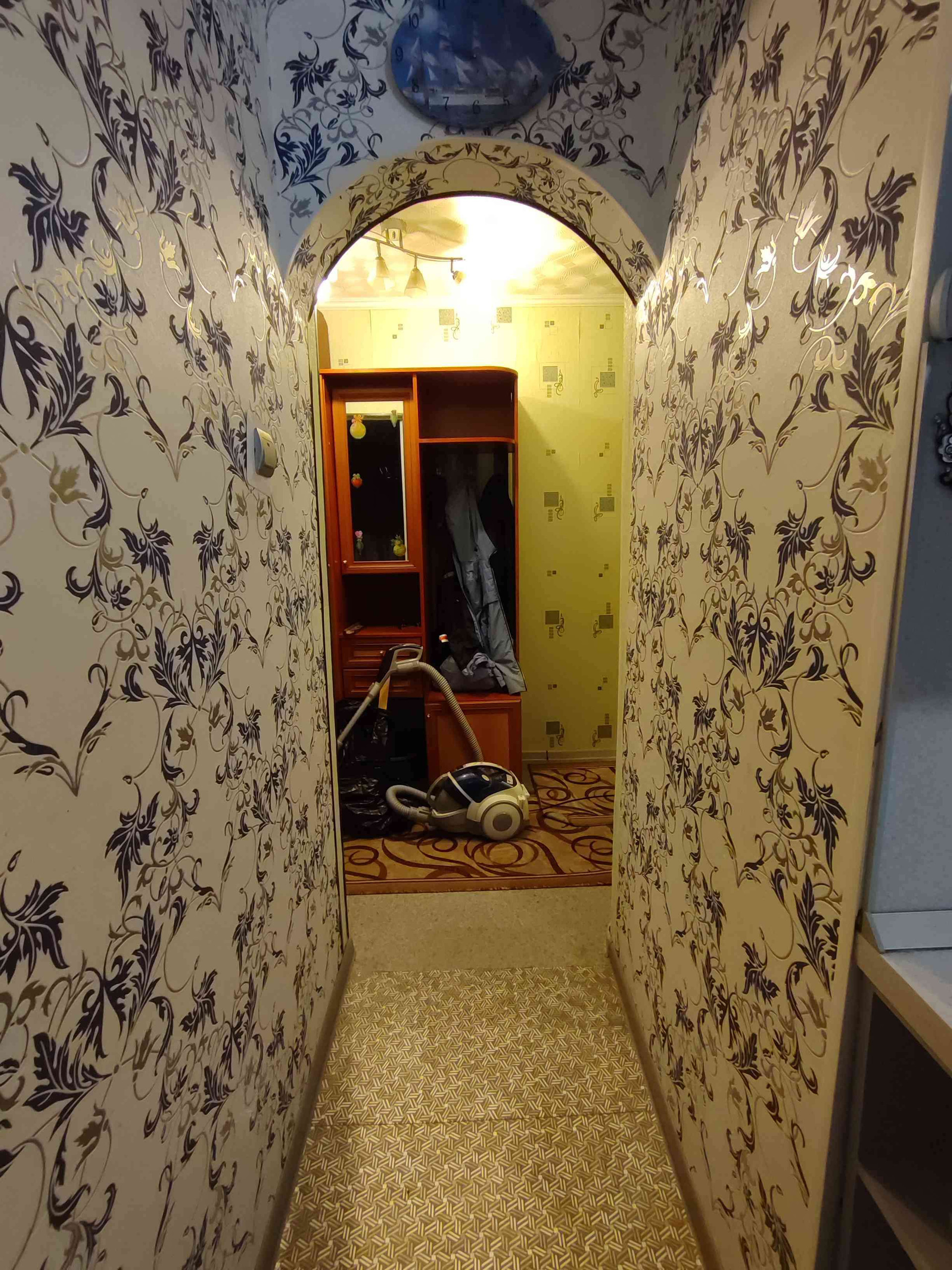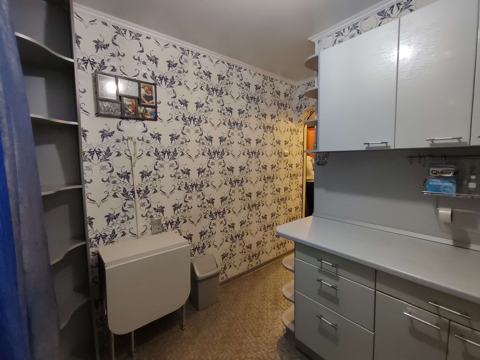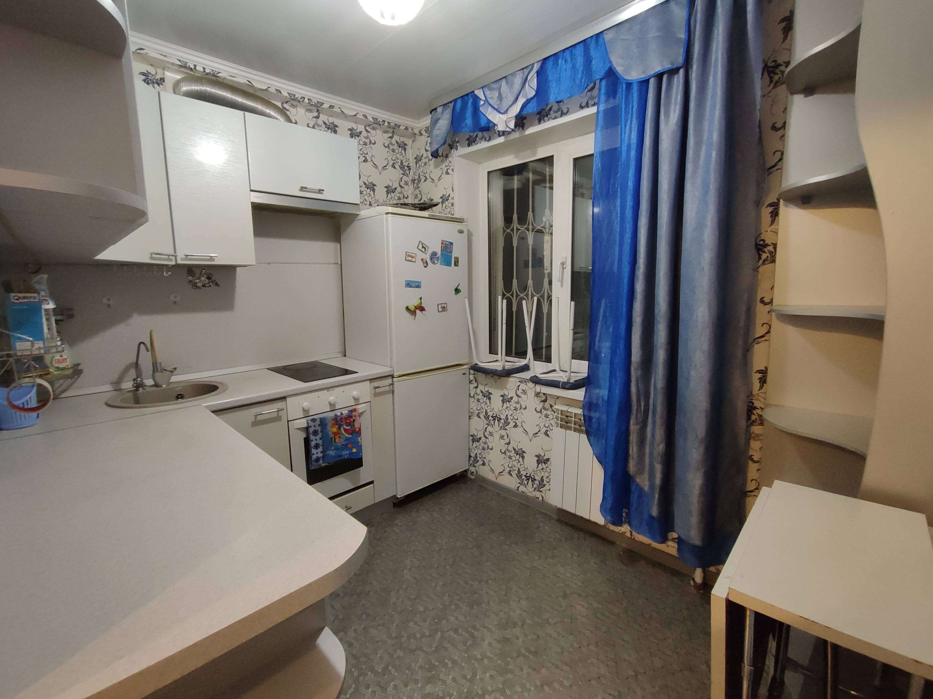 Напольное покрытие линолеум, стены оклеены обоями, навесные потолки, пластиковые окна.