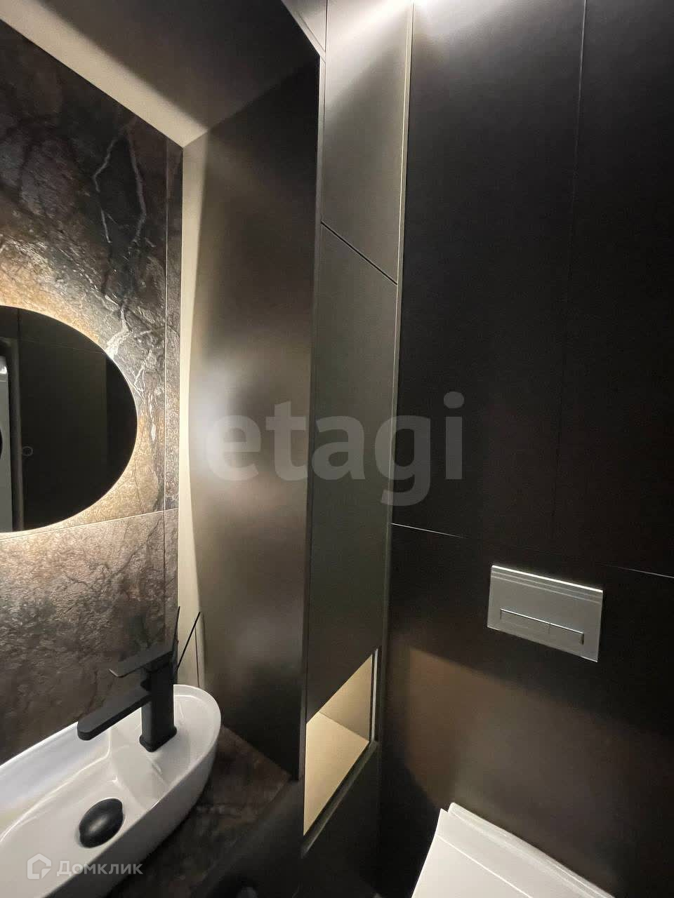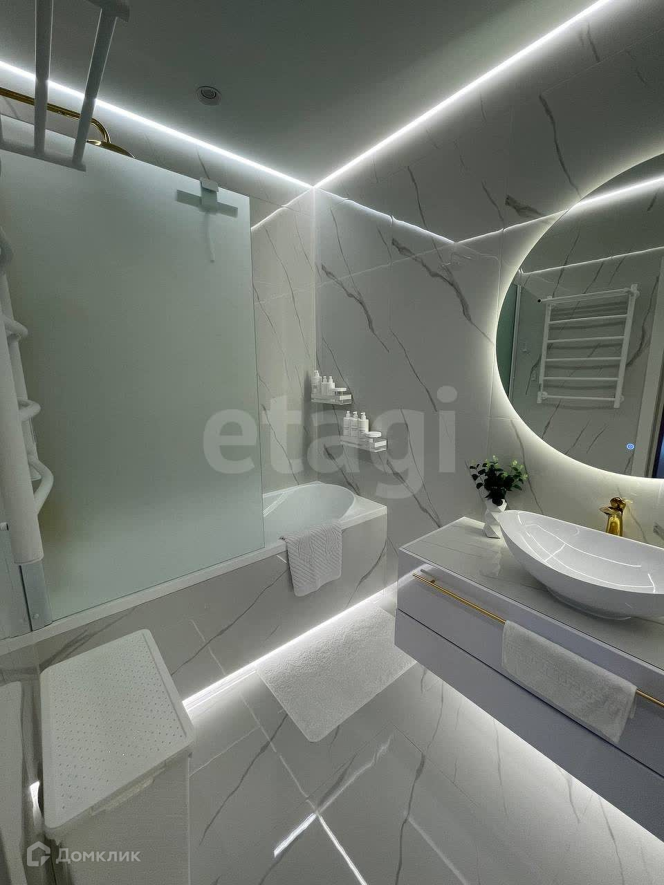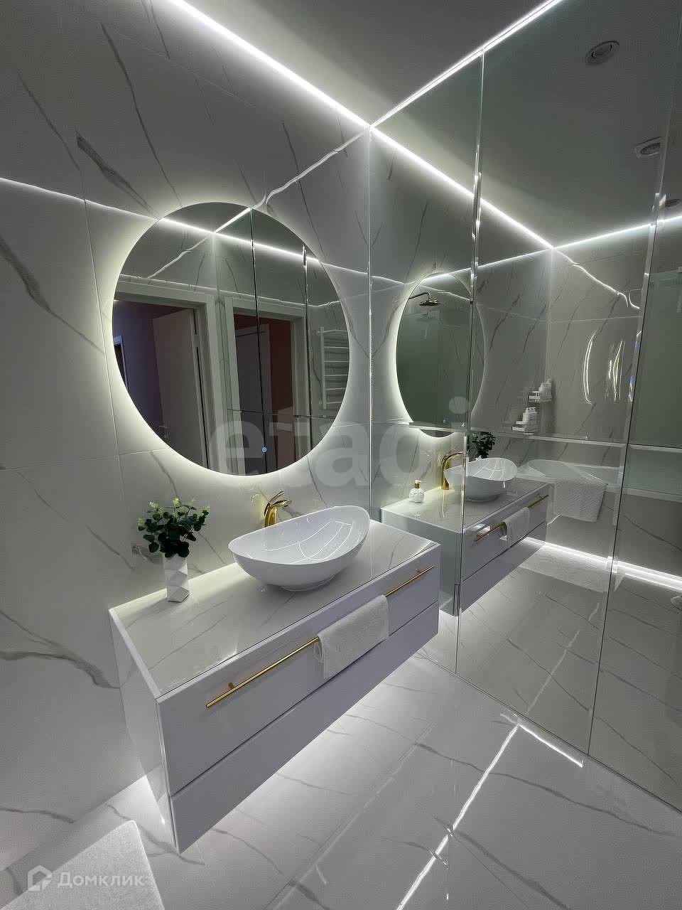 ВАННАЯ: справа вмонтированы огромные зеркала на всю стену, которые визуально вдвое увеличивают пространство ванной. Теплый пол электрический с несколькими программами.Полотенцесушитель электрический с несколькими режимами и таймером. Ванная акриловая с антискользящим покрытием.Экран стеклянный матовый.Четыре режима света + электровытяжка.Подвесная тумба, выполненная на заказ со столешницей из керамогранита. Сантехника высокого качества цвета «золото». Круглое зеркало с подсветкой «парящий эффект».