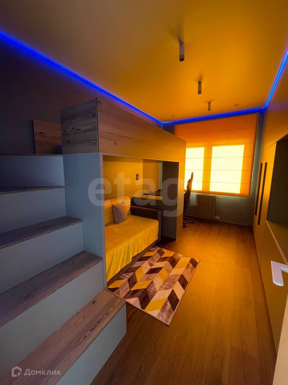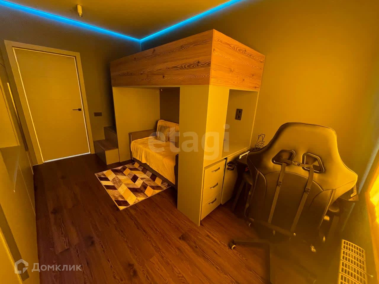 ДЕТСКАЯ комната: справа огромная система хранения на всю стену с нишей под телевизор, дверцы открываются от нажатия (визуально ощущение что это просто стена), двухъярусная система, на втором этаже спальное место 200*100, внизу диван раскладной на 2 человека. Комод. Комп.стол. Комп.стул