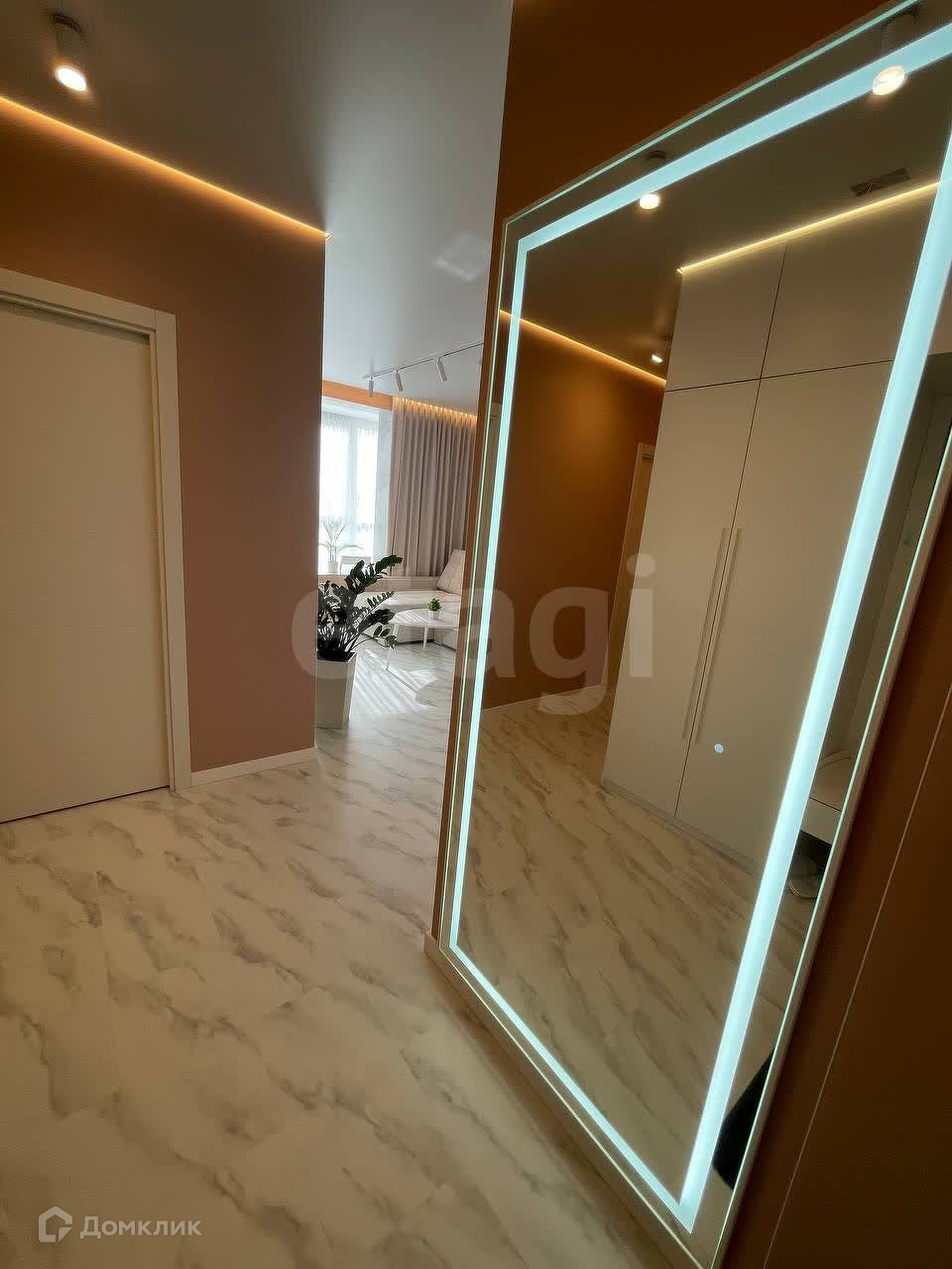 КОРИДОР просторный. Шкаф для одежды, огромное зеркало с подсветкой, выполненное под заказ. Три режима света.