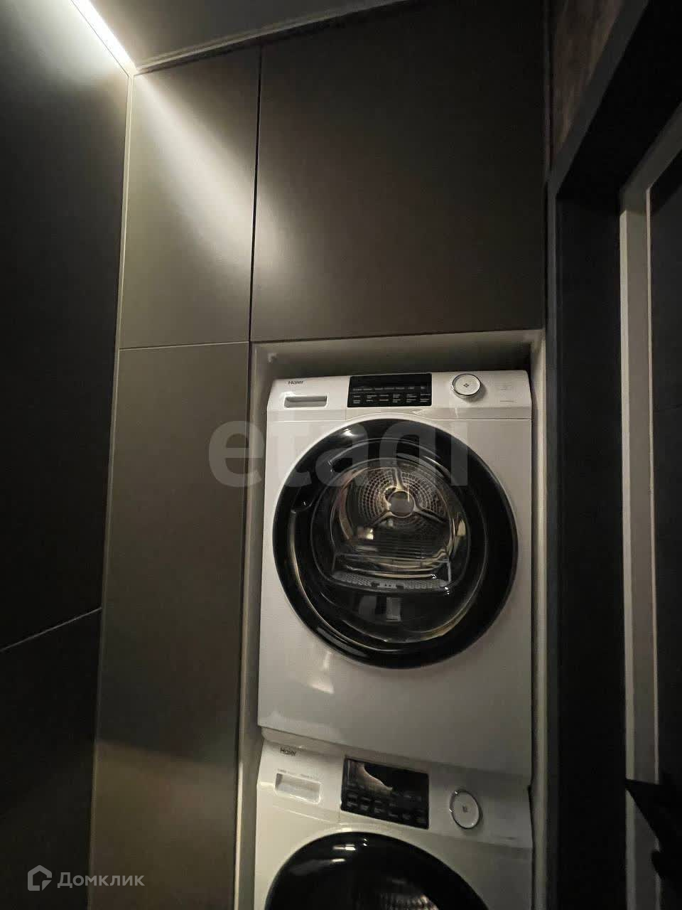 ТУАЛЕТ-ПОСТИРОЧНАЯ в стиле лофт. Стиральная машинка HAIER, сушильная машинка HAIER, огромная система хранения, с дверцами, открывающимися от нажатия. Раковина. Зеркало с подсветкой «парящий эффект». Два режима света+ электровытяжка.