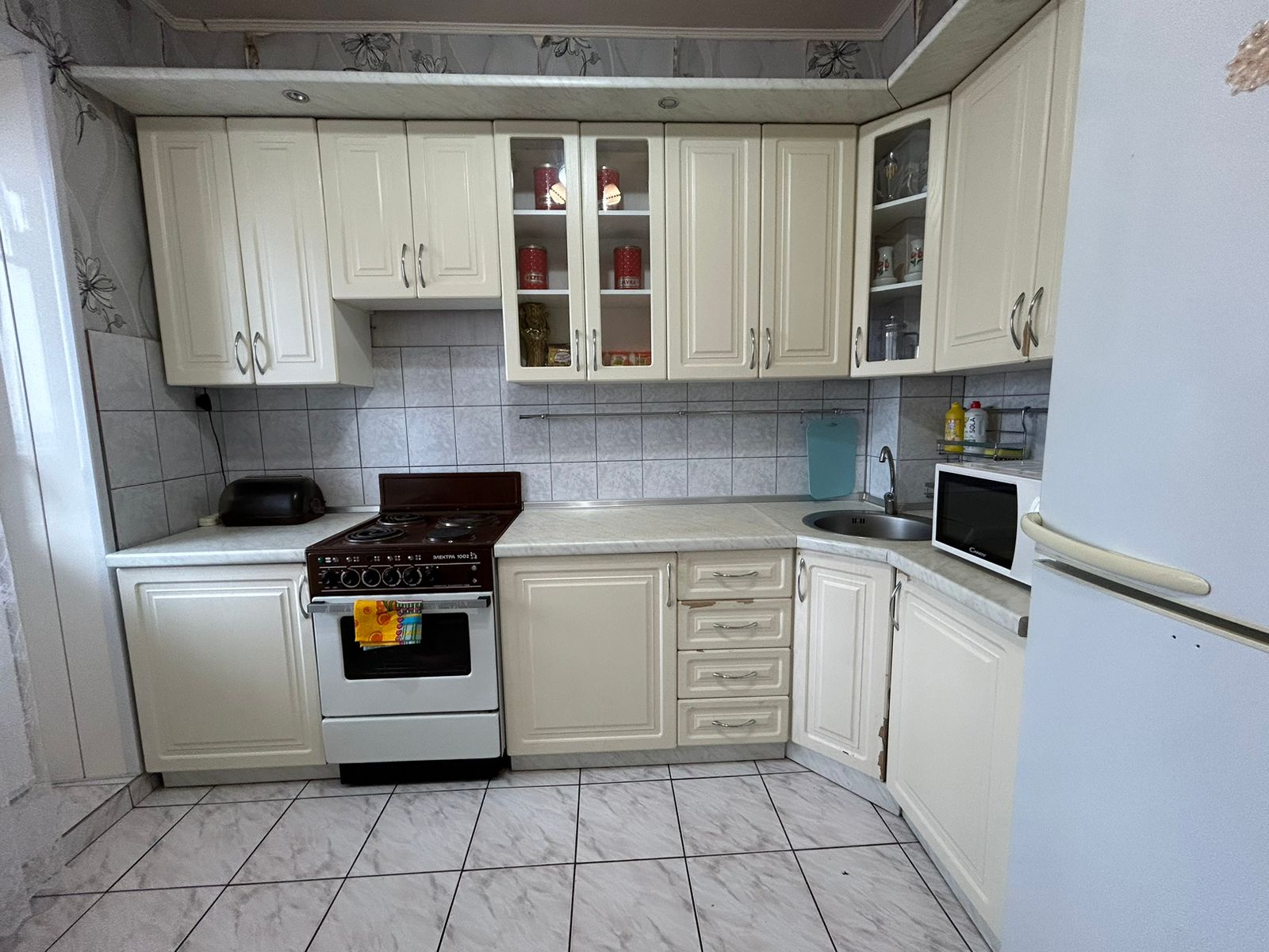 В квартире есть вся необходимая техника - плита, микроволновка, утюг, стиральная машина , холодильник, чайник, пылесос, телевизор, а также нужные мелочи - посуда на первое время, корзина для белья, гладильная доска, сушилка для белья.
