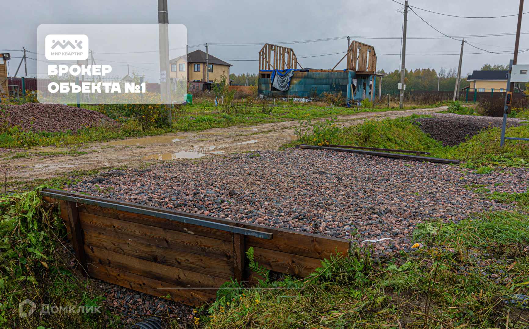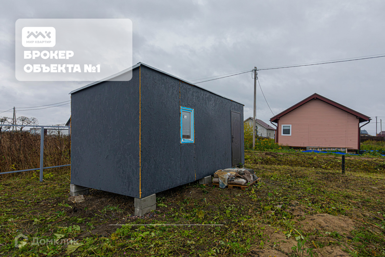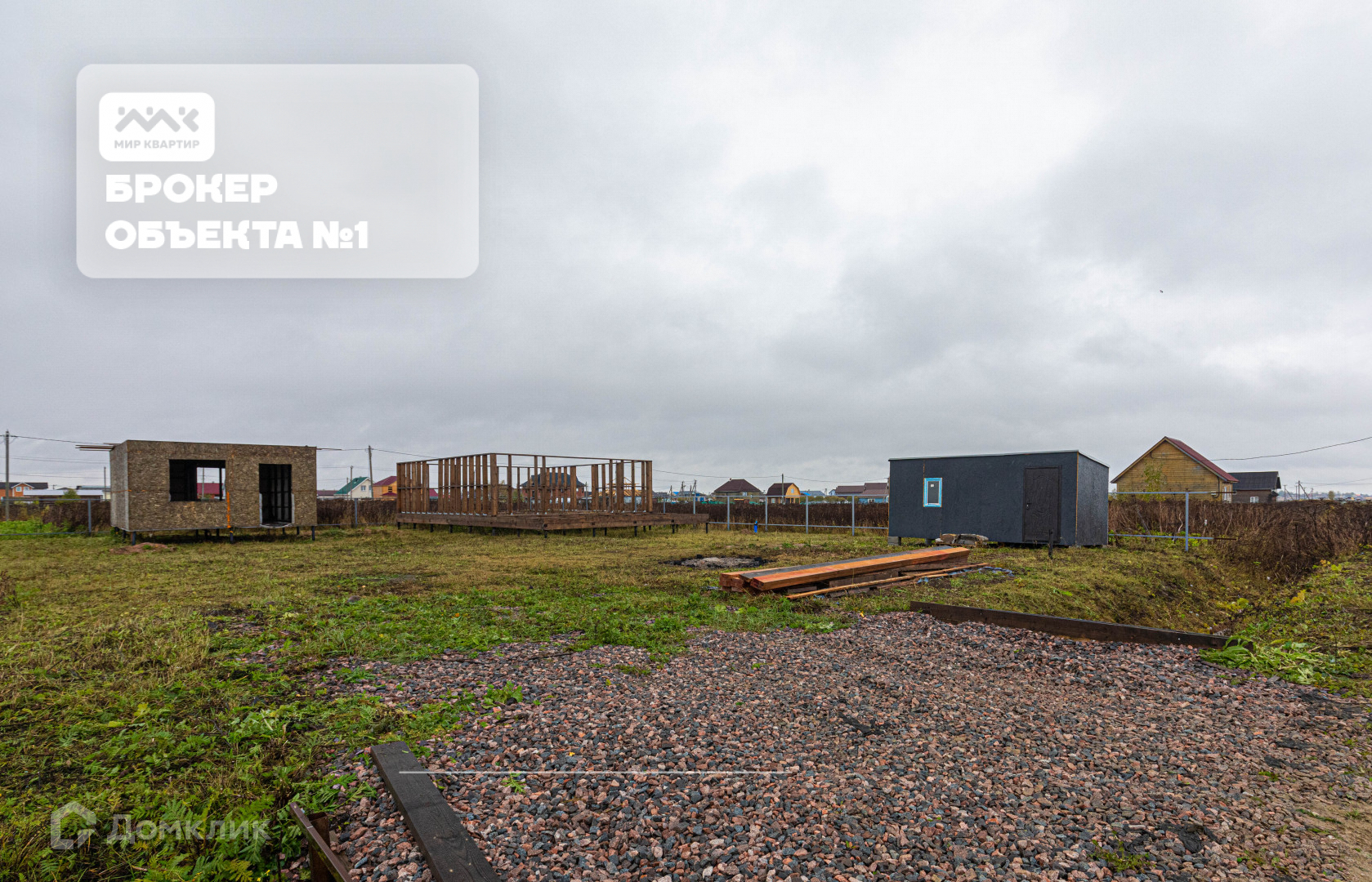 по всему периметру установлен забор. На территории участка уже установлен дом недострой на сваях и бытовка для строительных материалов.