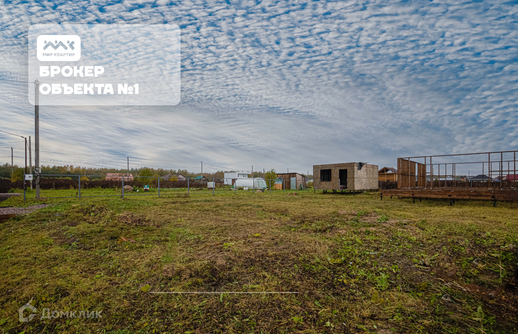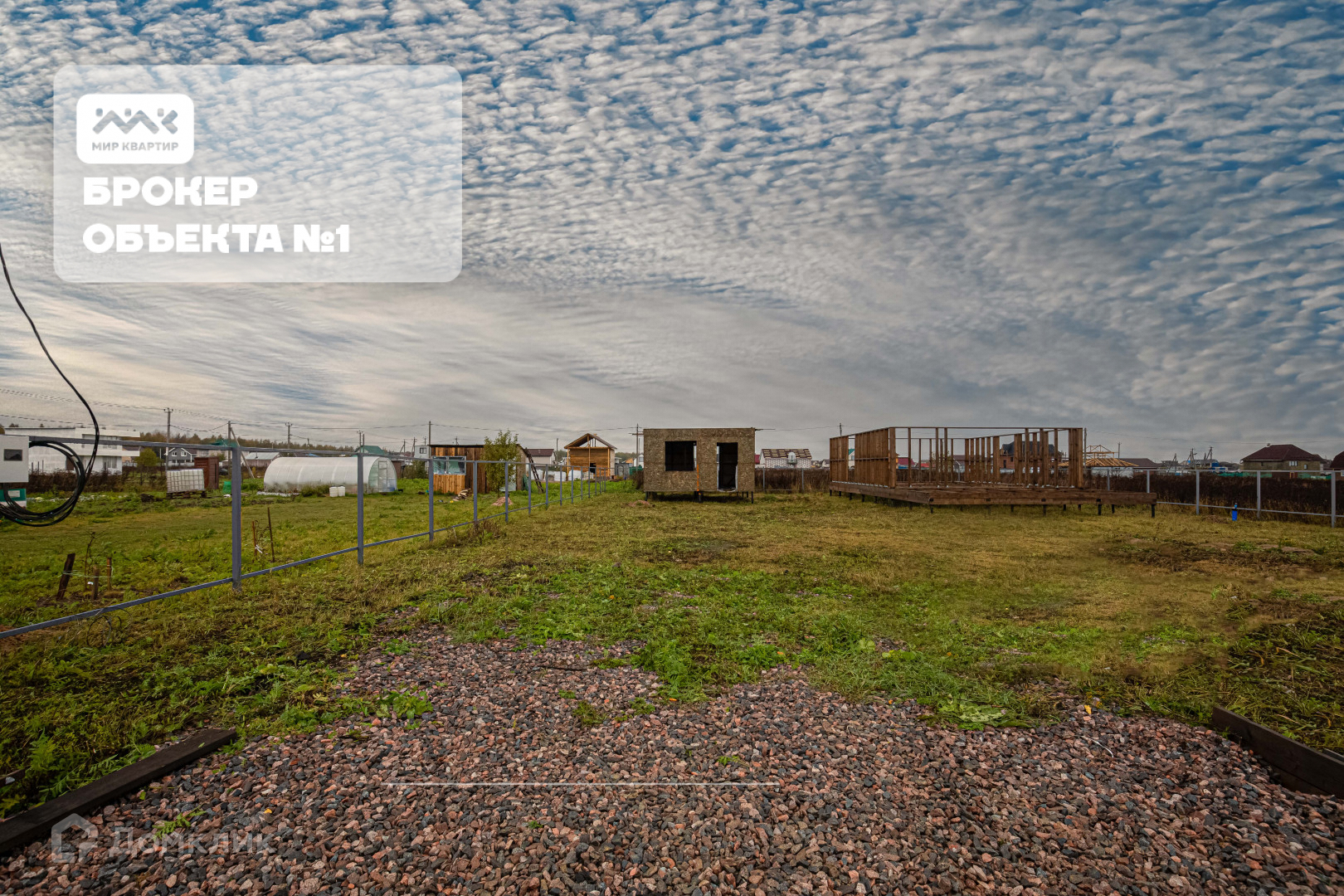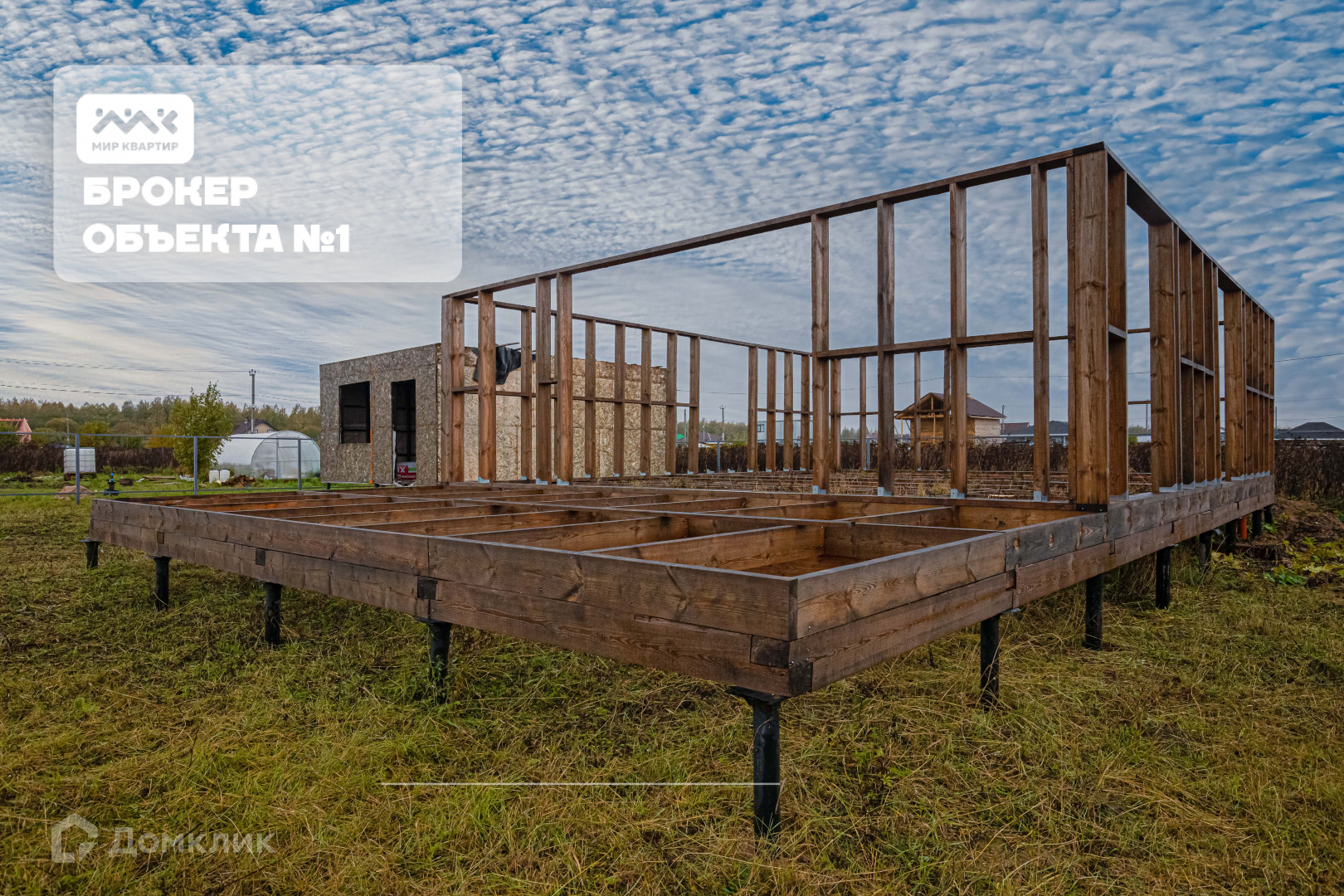 по всему периметру установлен забор. На территории участка уже установлен дом недострой на сваях и бытовка для строительных материалов.