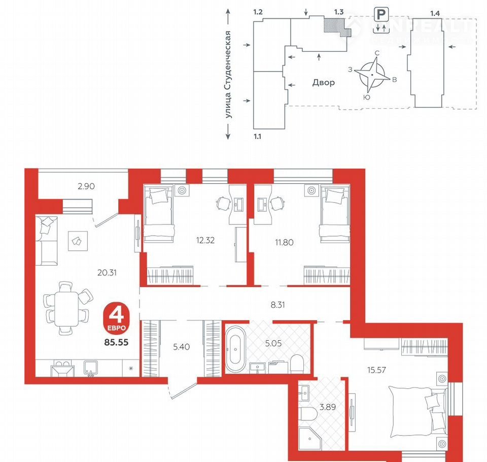 площадь квартиры - 85,55 кв.м