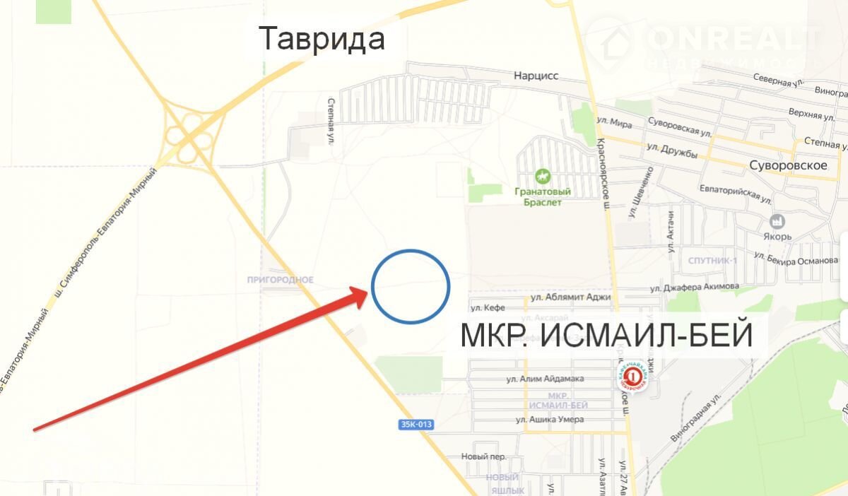 Отличное расположение: рядом асфальтированная дорога, обжитой микрорайон Исмаил-Бей, а с другой стороны съезд на трассу "Таврида". Всего в 10 минутах от города — и вы уже в Евпатории 15 минут на авто до моря.