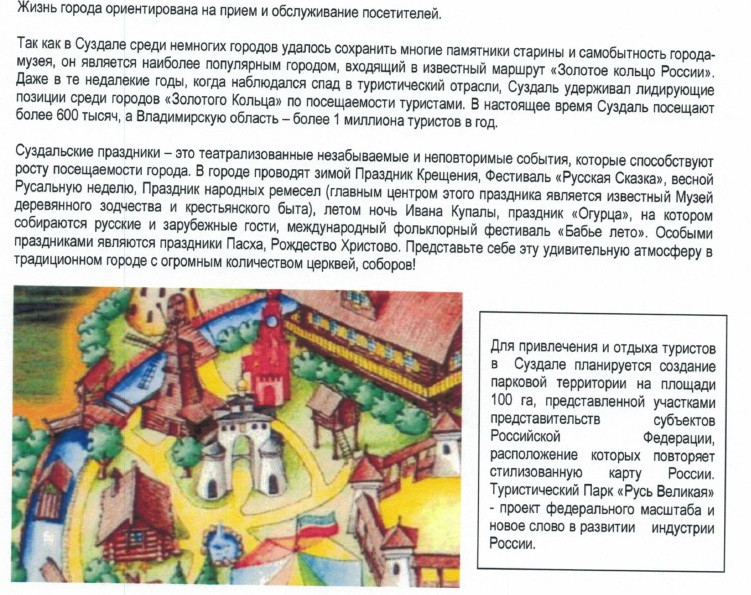г. Суздаль- районный центр Владимирской области, стоящий в 37 кв от Владимира на реке Каменка, находится в 140 км от г. Иваново, 265 км от г. Нижнего Новгорода и Ярославля. Близость Суздаля к Столице России 200км, удачное географическое расположение, транспортная доступность укрепляет активный рост посещаемости города туристами. Жизнь города ориентирована на прием и обслуживание посетителей. Так как в Суздале среди немногих городов удалось сохранить многие памятники старины и самобытность города-музея, он является наиболее популярным городом, входящим в известный маршрут «Золотое Кольцо России». Суздаль удерживает лидирующие позиции среди городов «Золотого Кольца» по посещаемости туристами. В настоящее время Суздаль посещают более 600 тысяч туристов в год.
