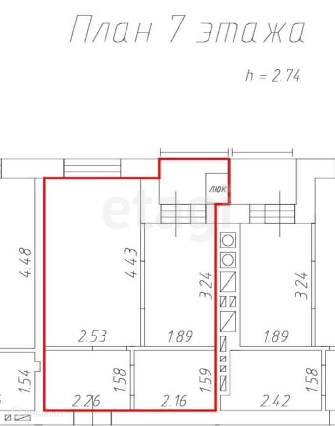 Общая площадь квартиры 24.3 кв.м., без учета лоджии. Высота потолков 2.74 метра.