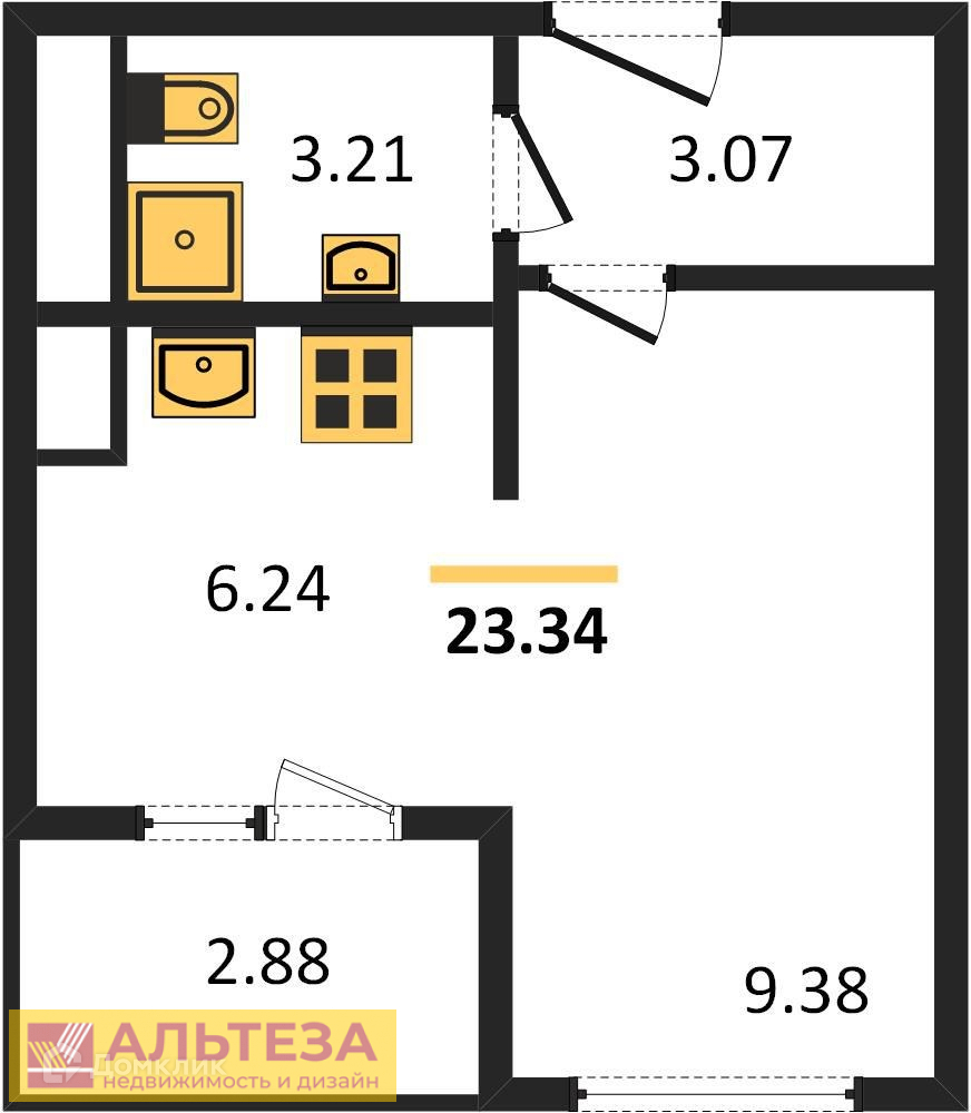 , Светлогорск г, Молодежная улица 6к1, 1 комн., общ. пл. 23.34 кв.м., жил.пл. 9.38 кв.м., комнаты 9.38, кухня 6.24 кв.м., 5/7 этаж, окна двор, санузел совмещенный, лоджия, без отделки, Номер лота: 4234742