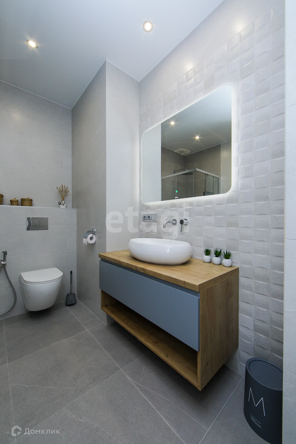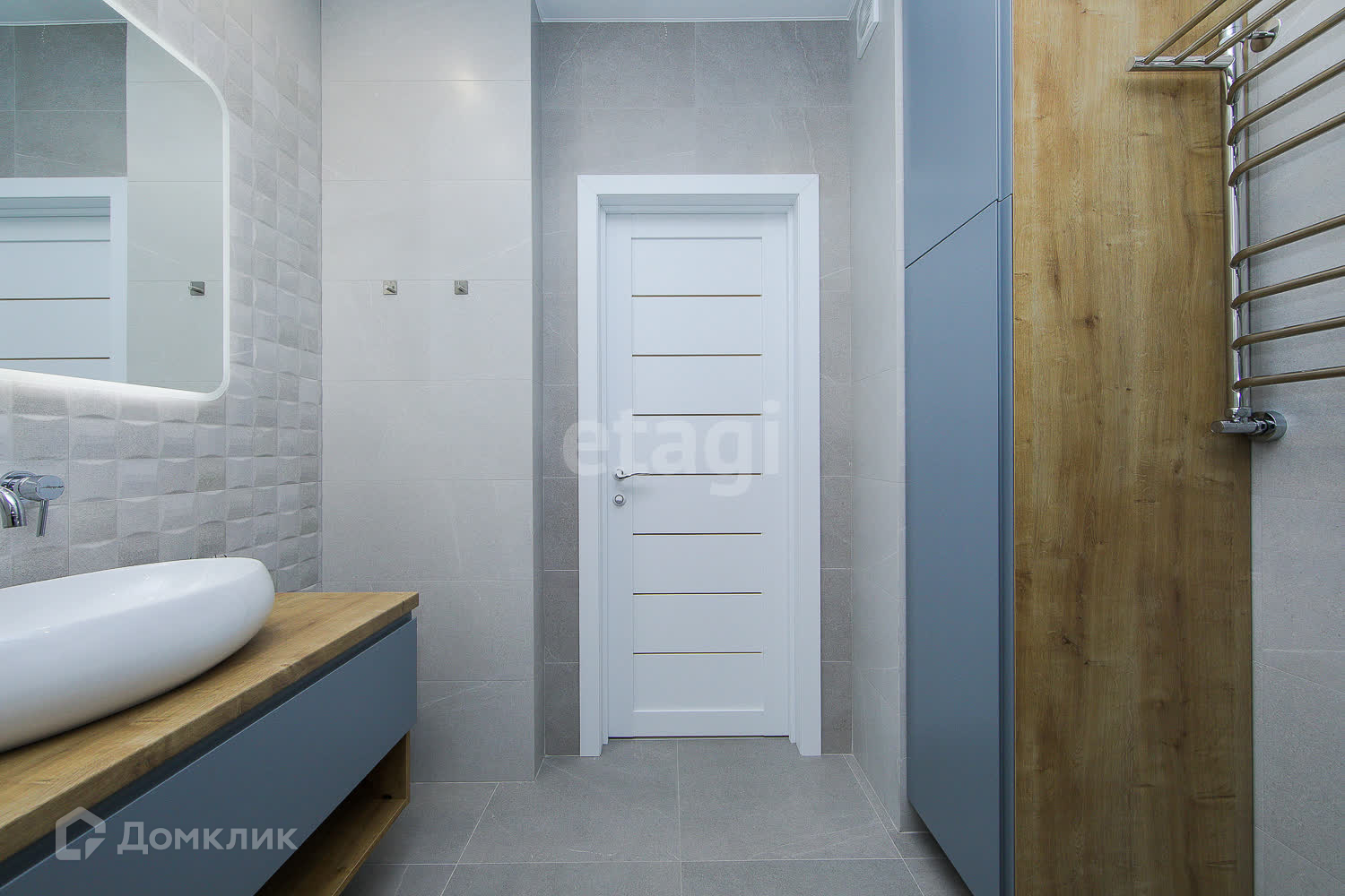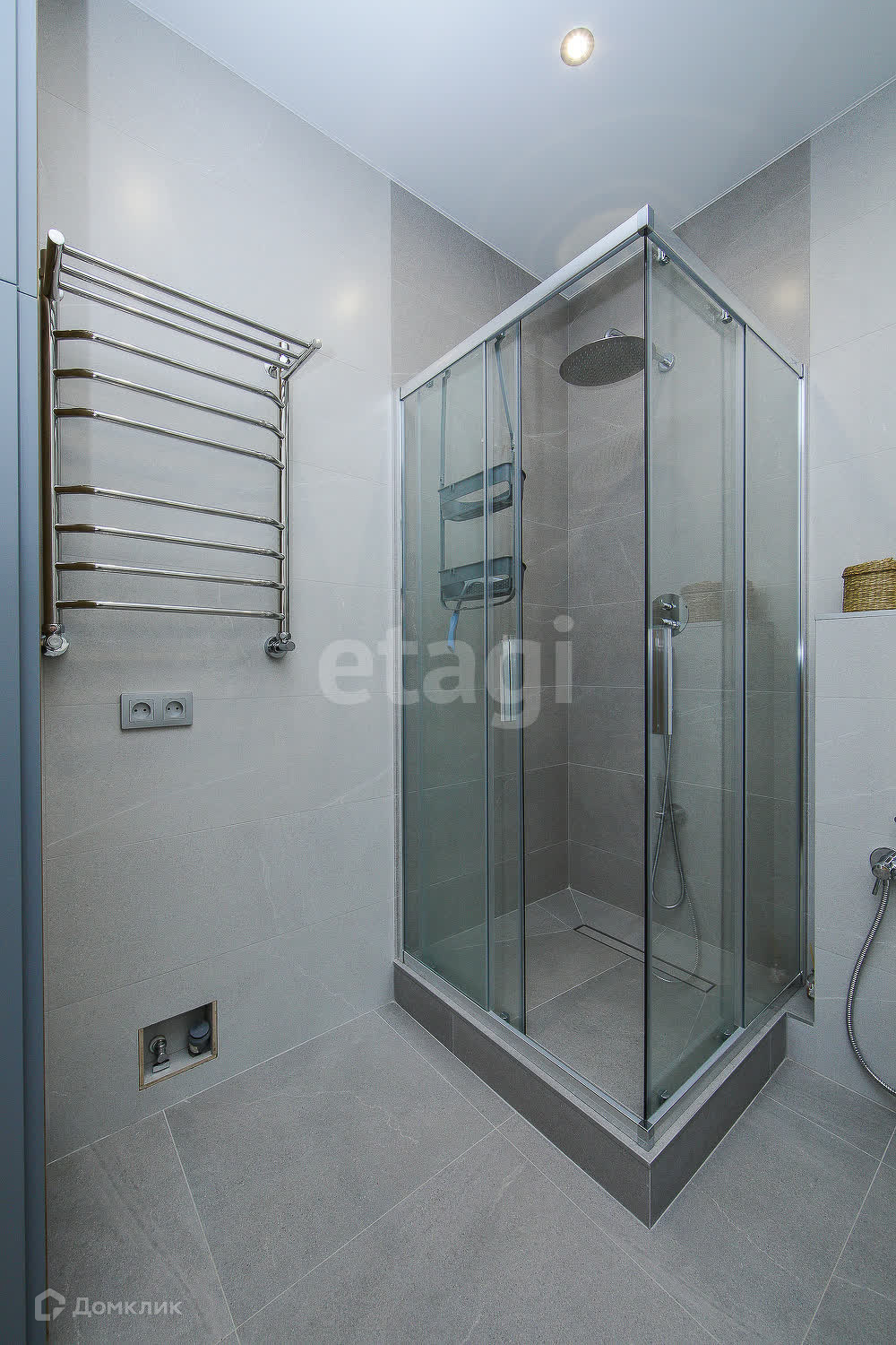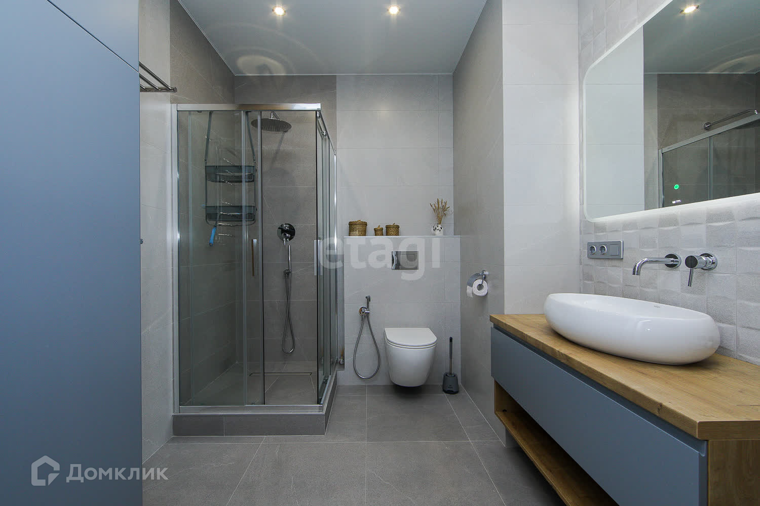 ● очень просторный совмещённый сан.узел - 5.7 кв.м., в котором без труда разместились вместительный шкаф для туалетных принадлежностей, душевая кабина, тумба с раковиной и стиральная машина. В сан.узле сделан тёплый пол ( керамогранит Испания)