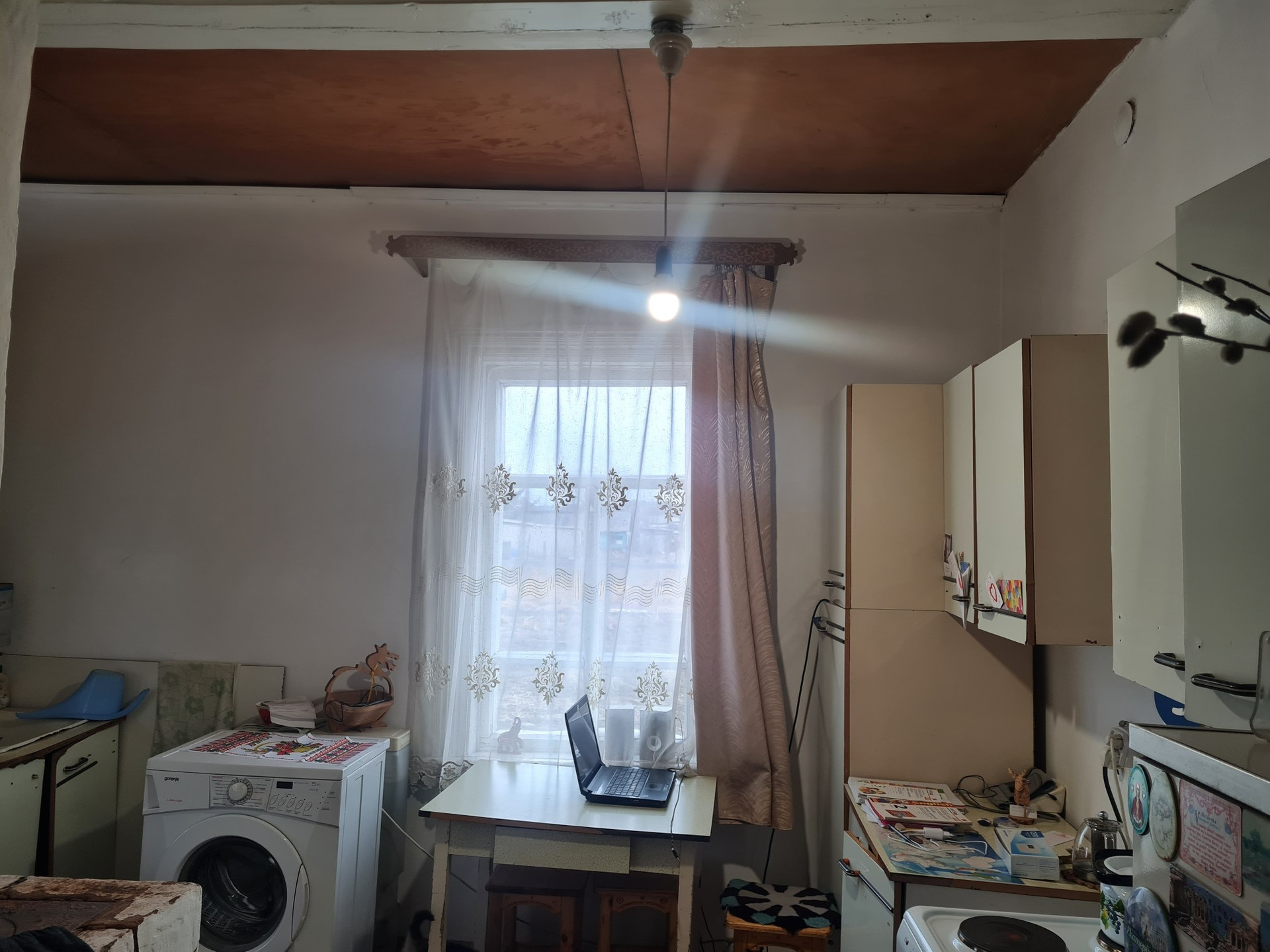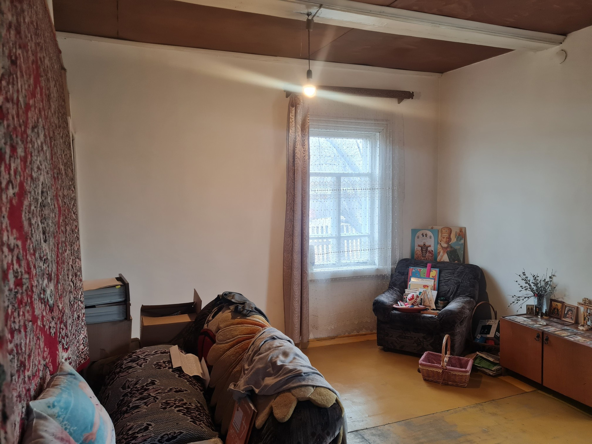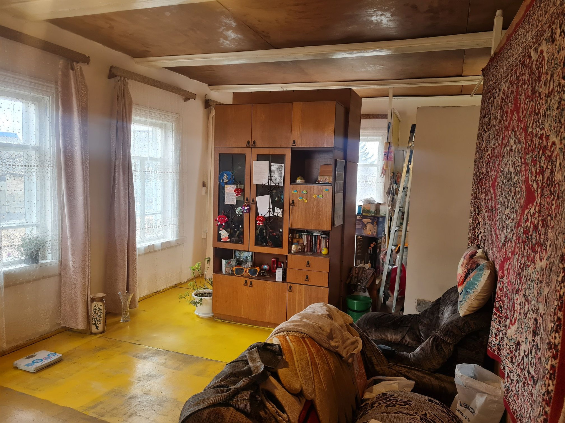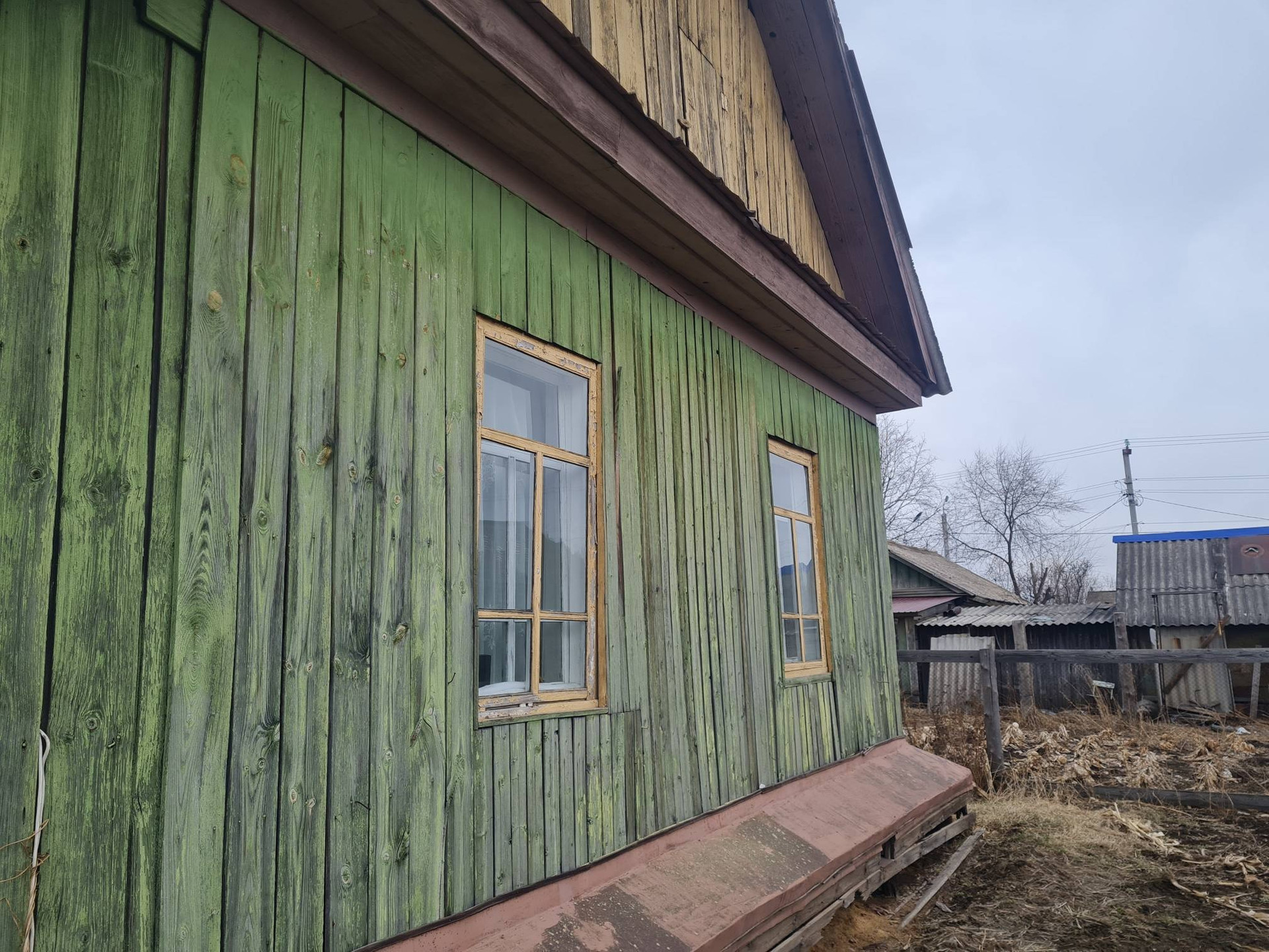 Высокие потолки,окна деревянные,печное отопление,потолки обшиты аргалитом,полы аргалит-окрашены,на кухне линолеум,имеется скважина 27м,из построек:сарай,дровник,баня не достроена.