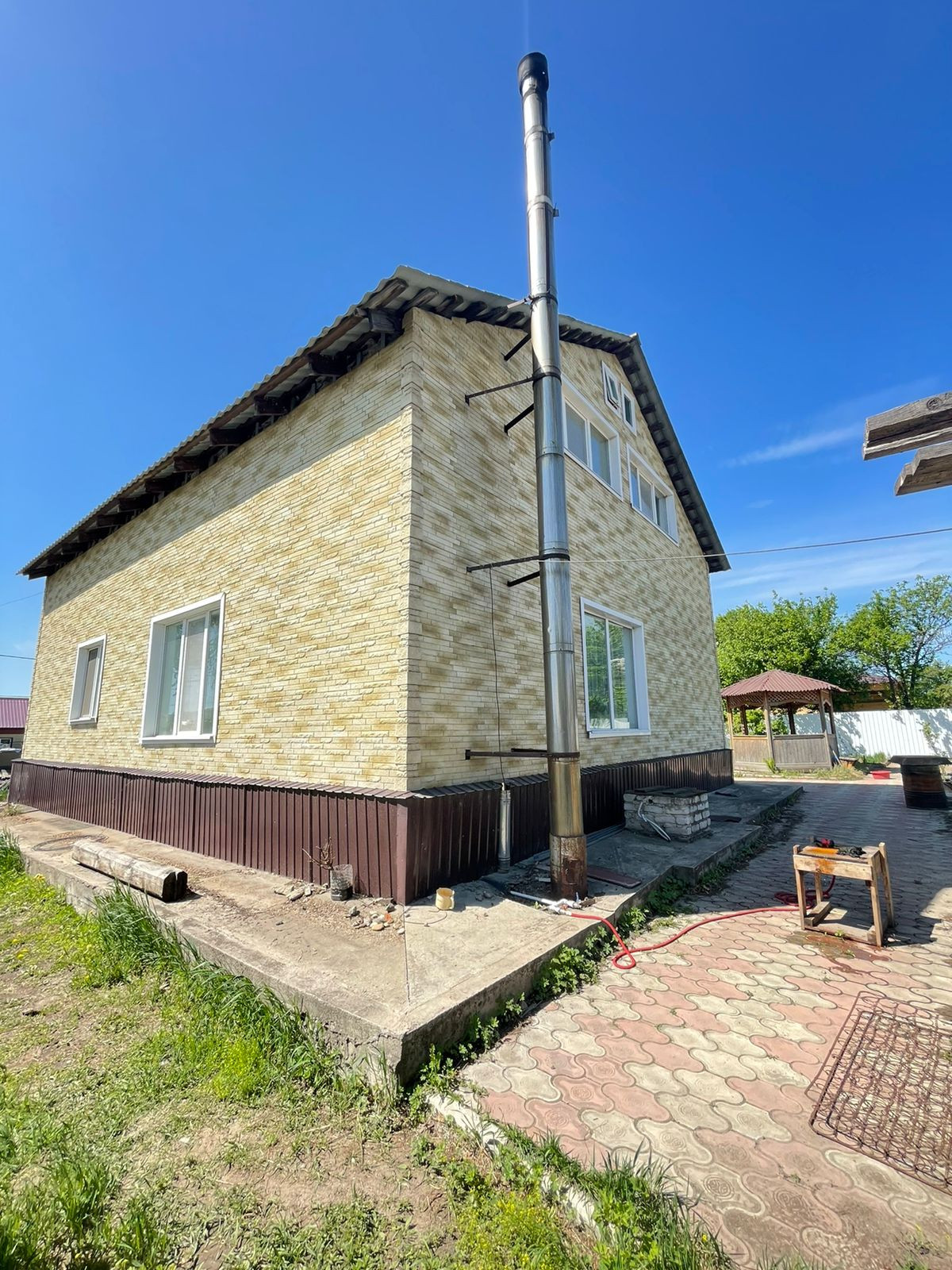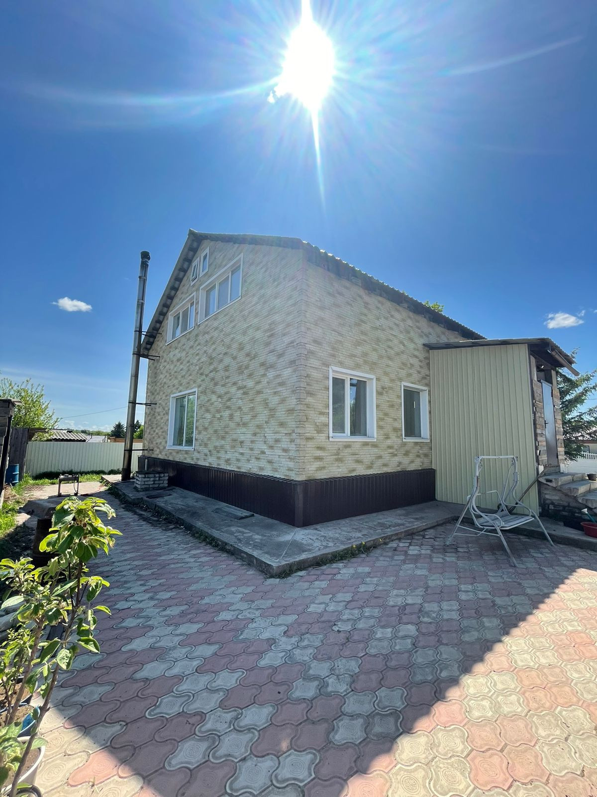Ухоженная придомовая территория, во дворе выложена тротуарная плитка, по периметру железный забор.