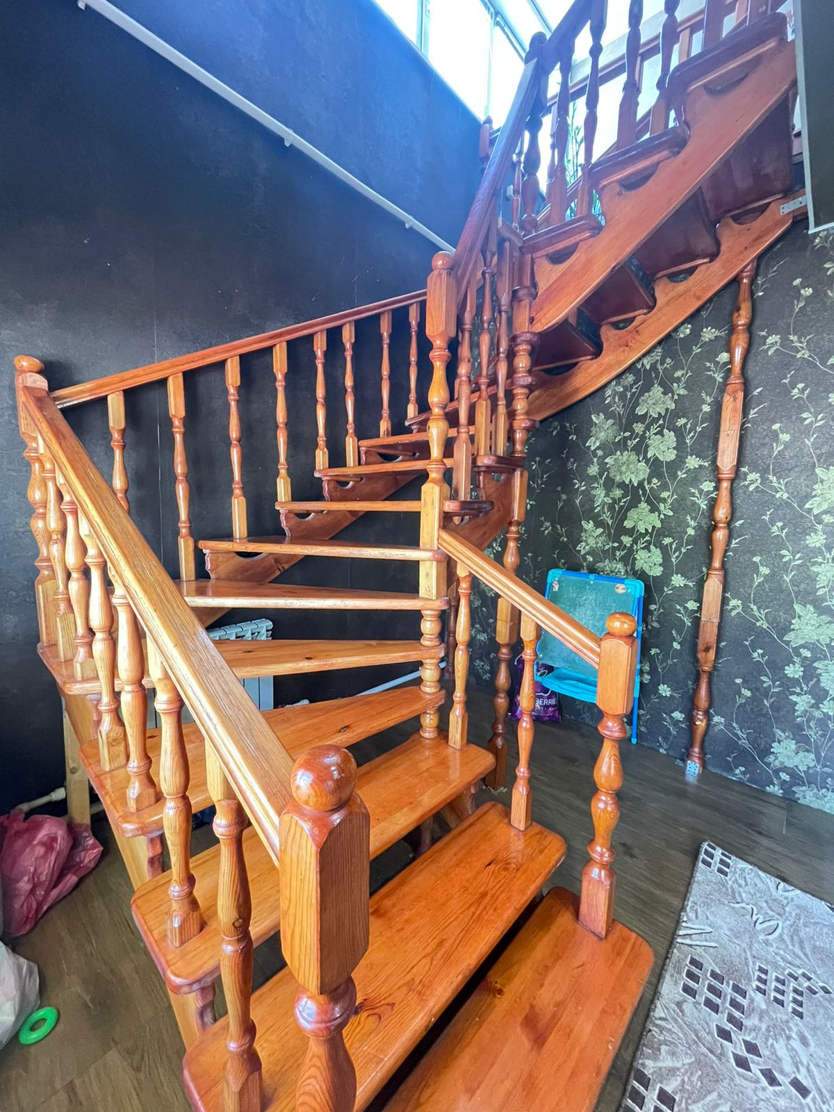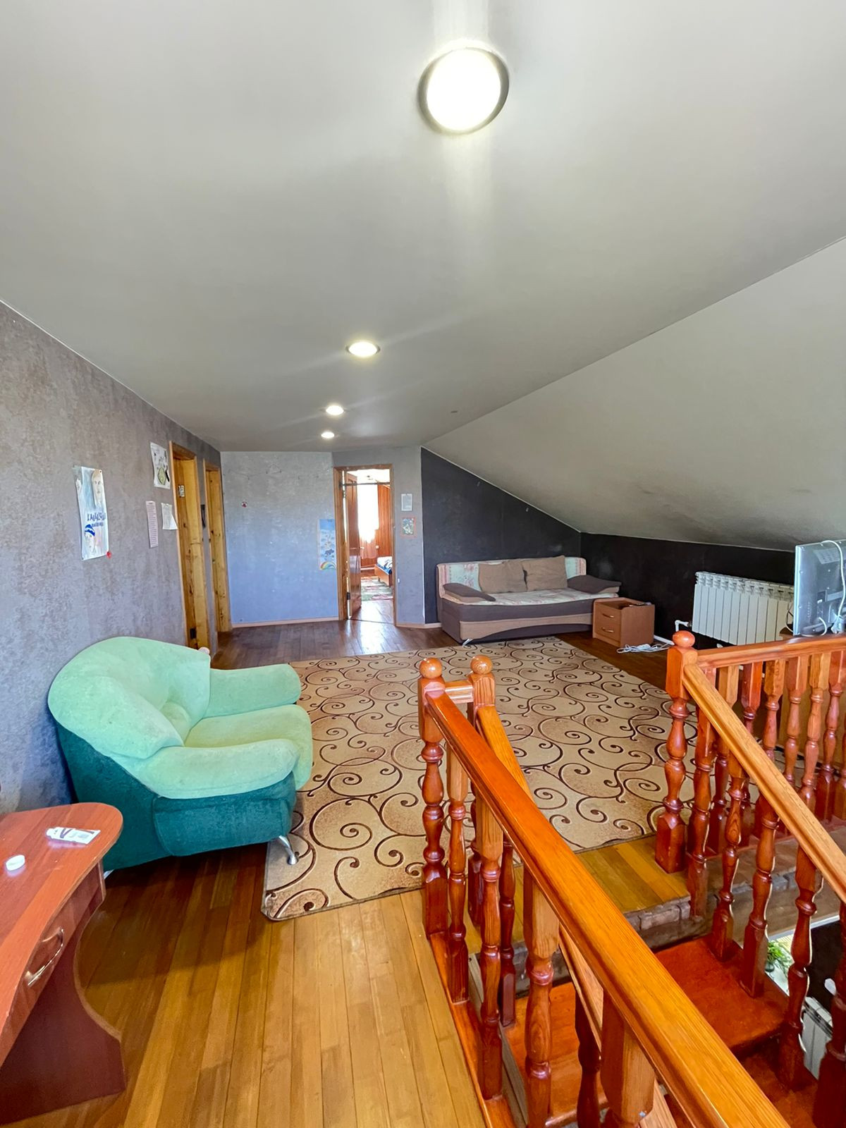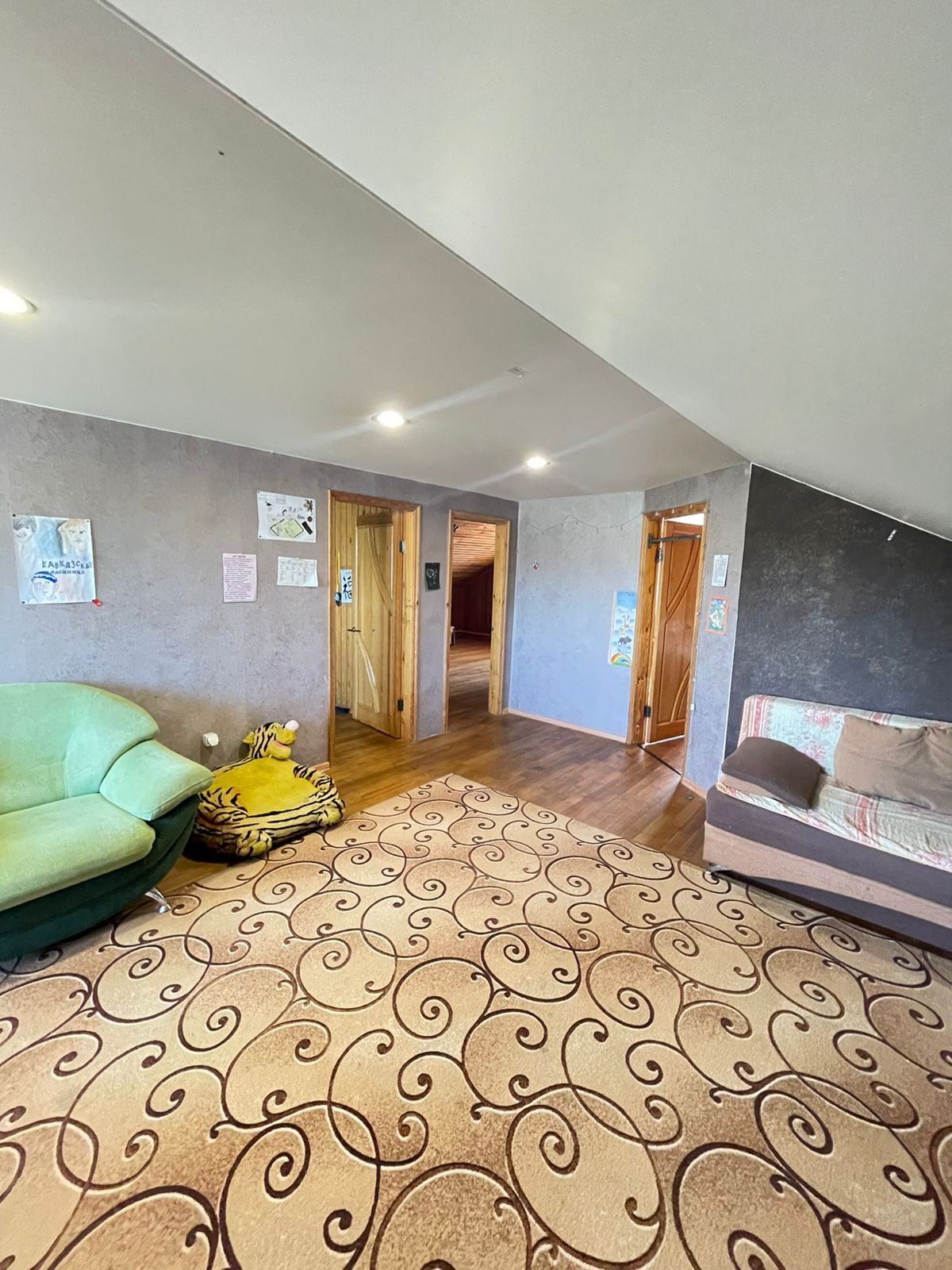 На первом этаже большая кухня, застекленный балкон, гостиная, имеется кладовая, на втором этаже три спальни.