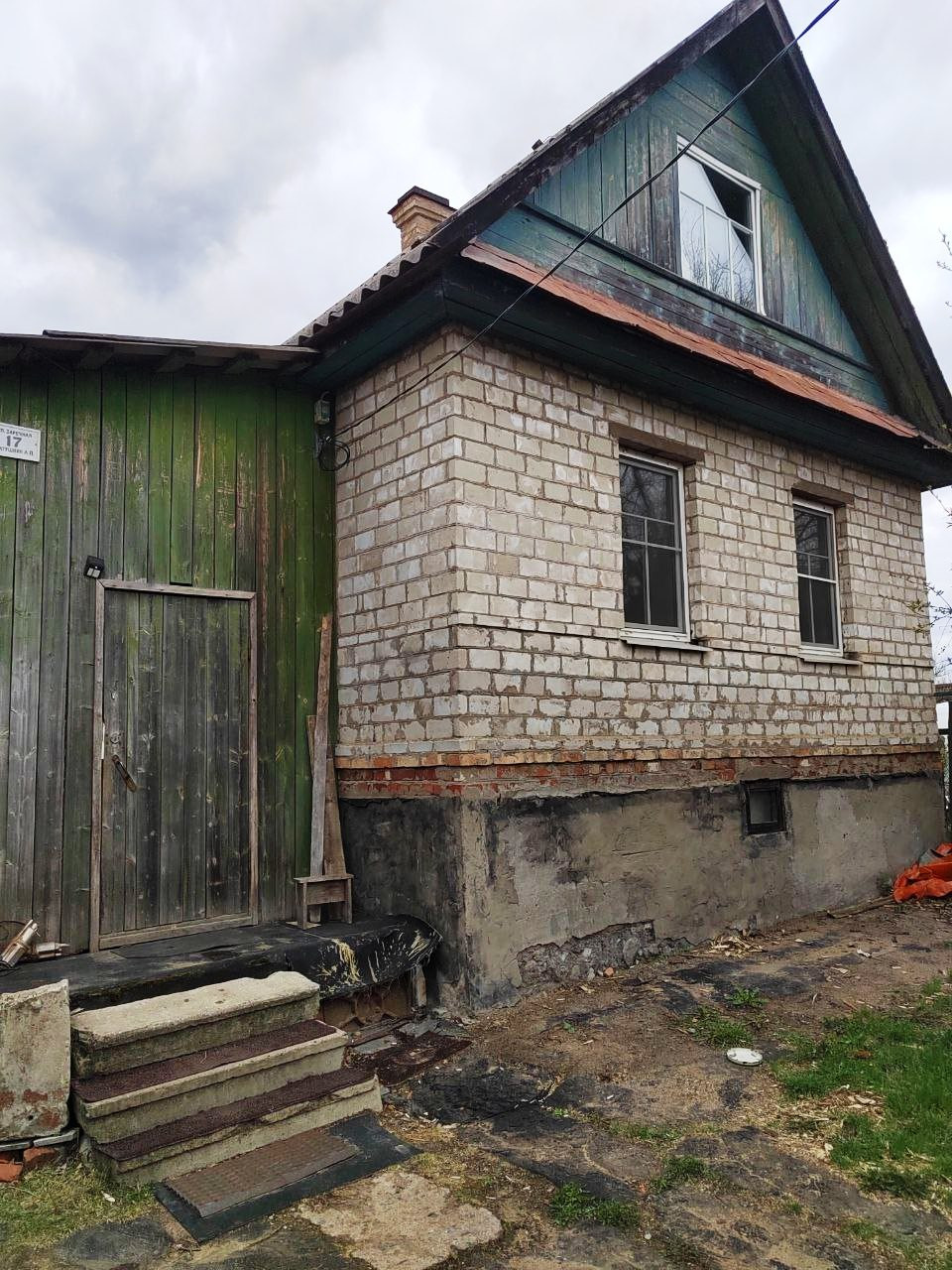 Материал стен - бетон, с наружной облицовкой кирпичом. Высокий бетонный фундамент, кровля - шифер, окна металлопластиковые.