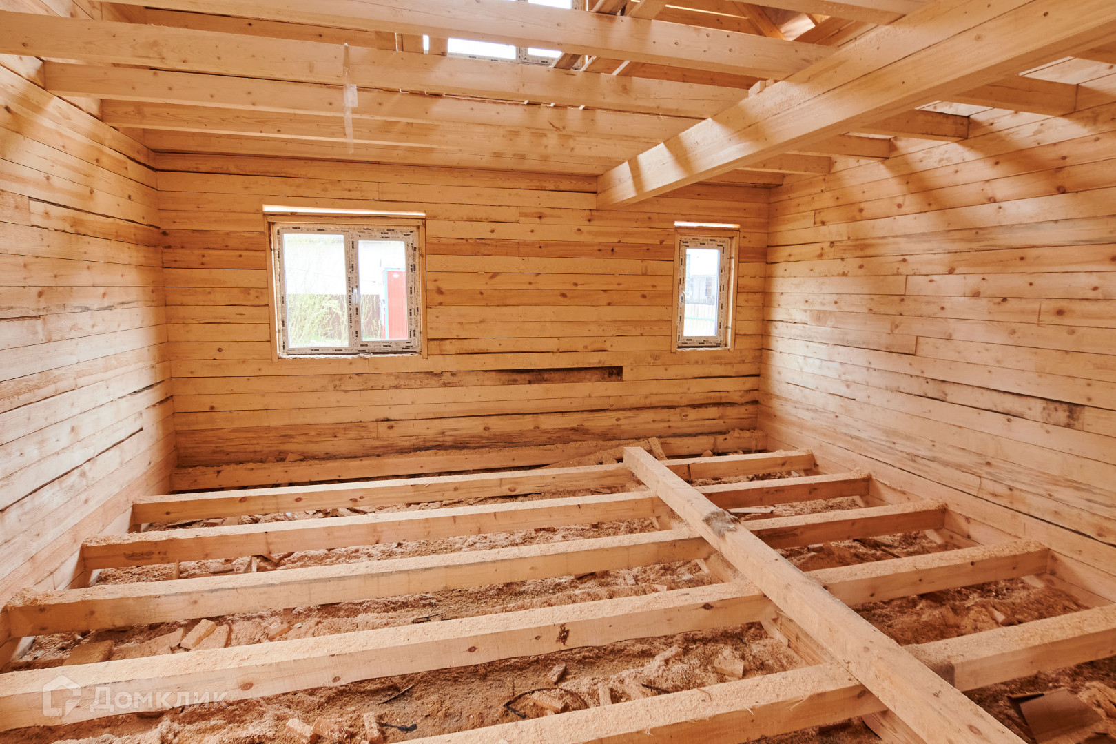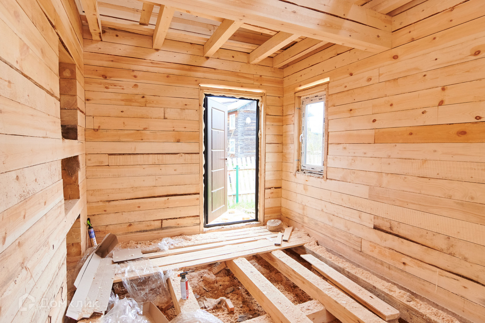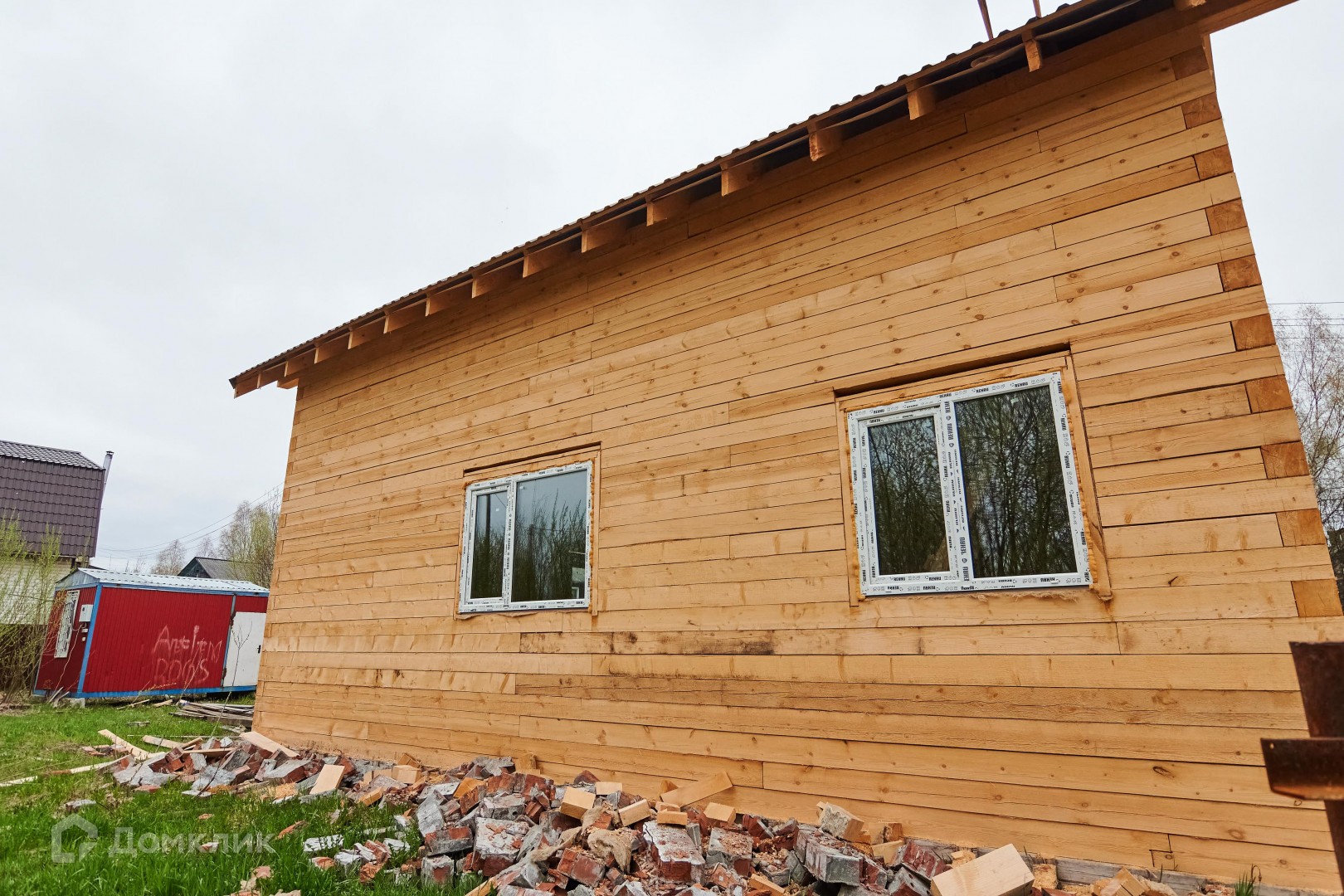 -Материал  брус 150\150.  Дом установлен на ленточном фундаменте,  возведен  под  крышу,     установлены  пластиковые окна, металлическая дверь
