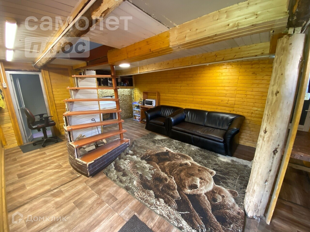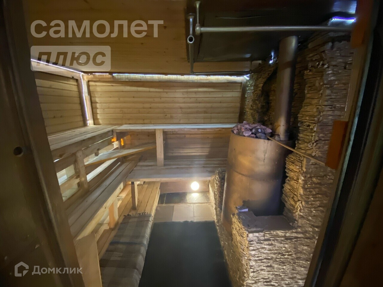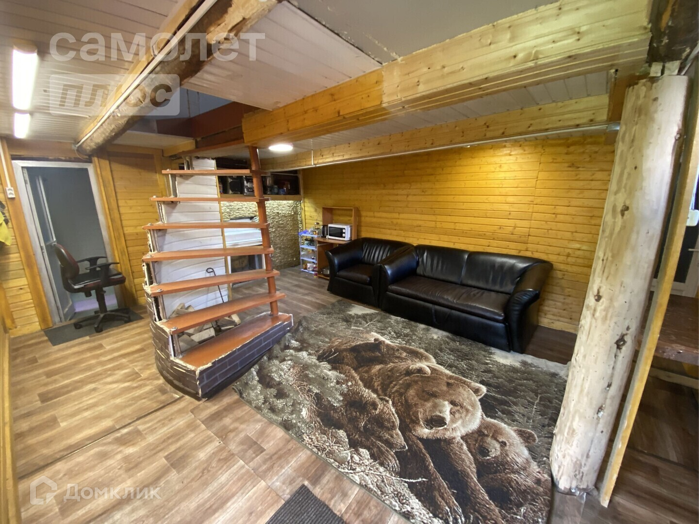 Первый этаж выполнен из рубленого бруса ( баня-сауна, душевая комната, гостиная - кухня).