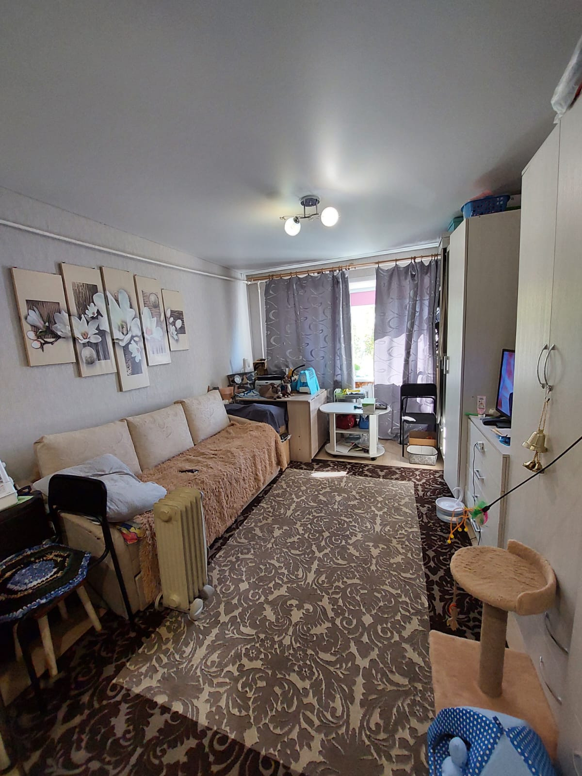 Остаётся кухонный гарнитур, 4-х створчатый шкаф, жалюзи блэк-аут на окне, карнизы, люстра. Завози диван и живи!!! или сдай студентам за 10тр))))