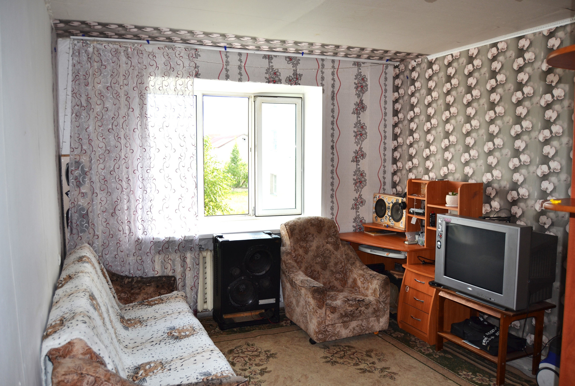 СОСТОЯНИЕ: Комната в обычном состоянии: установлен стеклопакет; пол – фанера; потолок - обои. Комната светлая, очень теплая. Совместно с комнатой остается и входит в стоимость: шкаф, диван, кресло, кухонный стол.