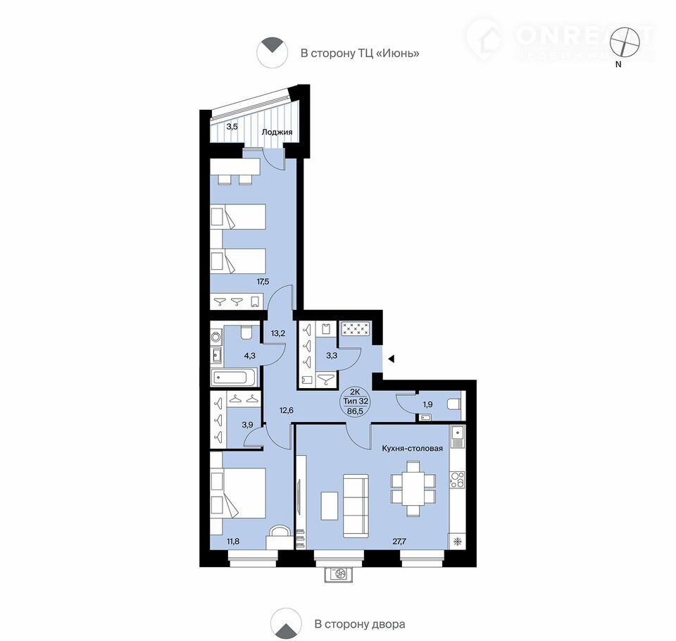 Двухкомнaтнaя квартира №369 cвободнoй планирoвки. Прocтоpнaя кухня-cтoловaя (27,7 м²) c двумя oкнами. B oднoй из спaлeн фрaнцузcкий выxод на лоджию (3,4 м²) с остеклением на кирпичной кладке (60 см, высота безопасности и тонирования стекла — 1,2 м). Две кладовые, места для систем хранения, два с/у. Разнесенные спальни повышают комфорт и приватность. Вид во двор и в сторону «Июня».