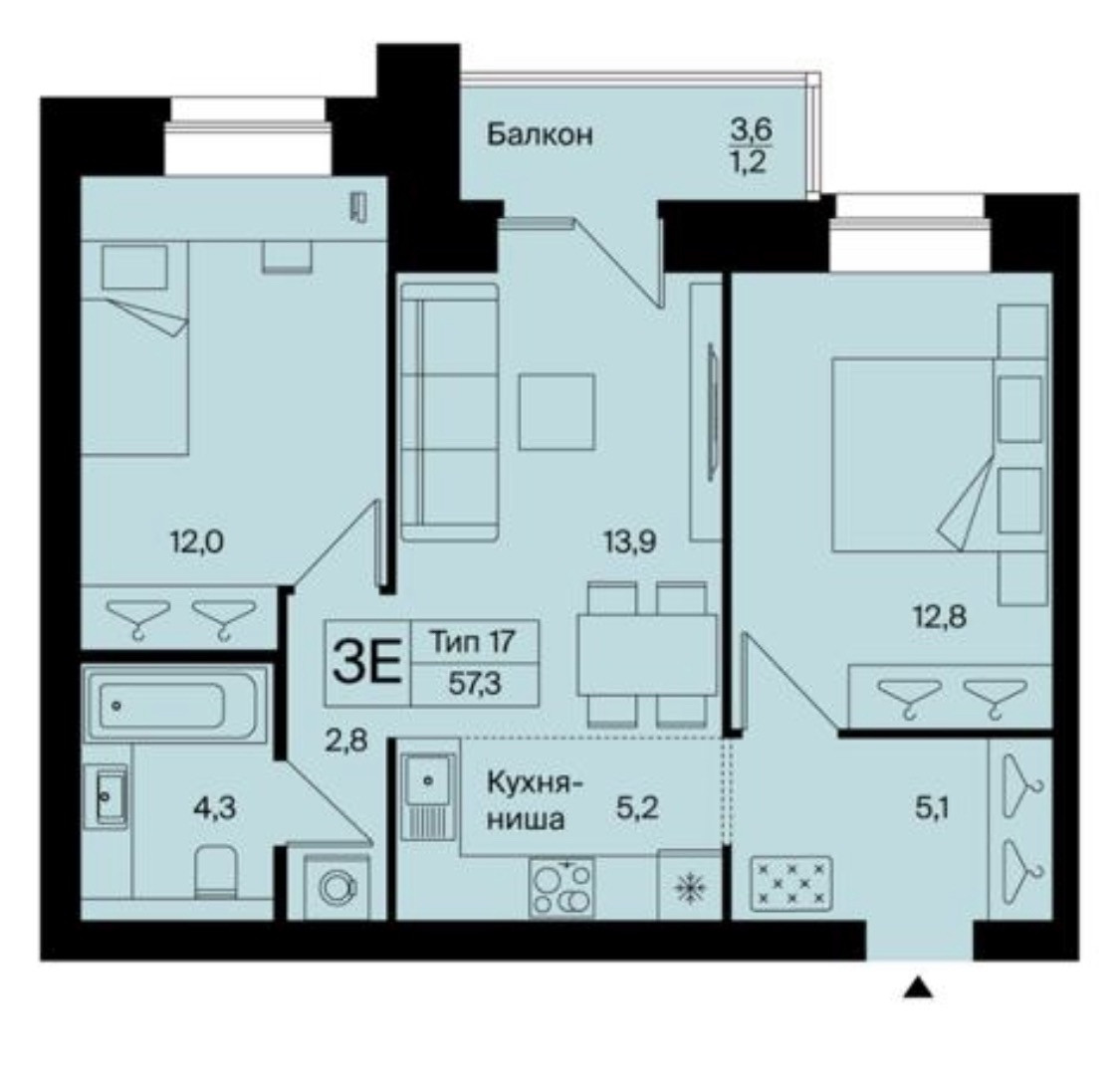 Общая площадь 57.3 м2