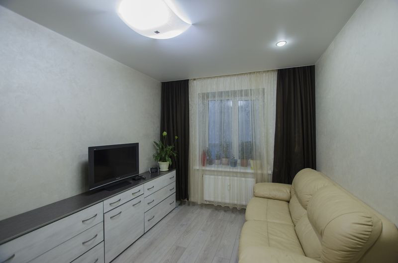 С отличным ремонтом. Можно въехать и жить. Остаётся кухонный гарнитур с плитой и холодильником, шкаф в комнате и прихожая.