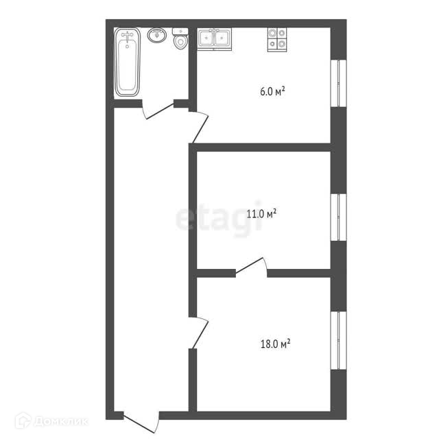 Общая площадь квартиры 39,2 м2. Состоит из двух комнат правильной формы площадью 11 и 18 м2, одна из них проходная.