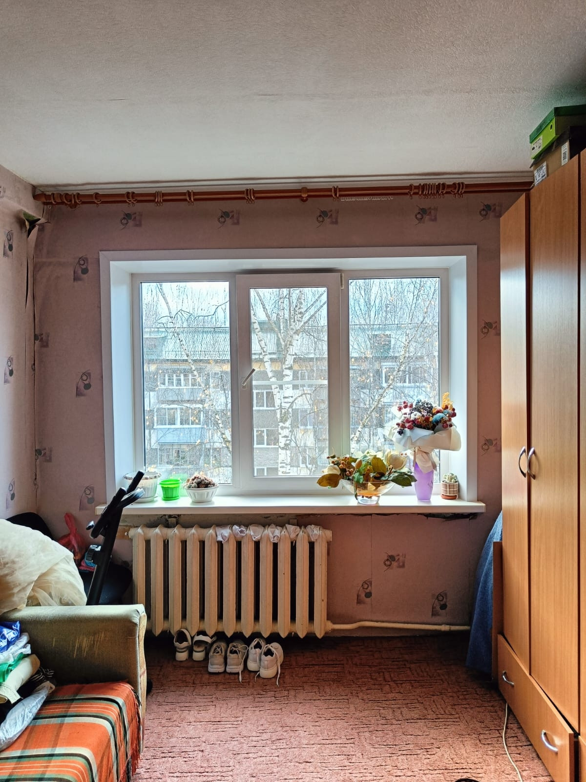 Квартира в хорошем состоянии: ровные стены, на окнах стеклопакеты, на полу линолеум, с/у, ванна совмещены, кафель, счетчики на воду. Балкон застеклен, обшит. Окна комнат выходят все на одну сторону, но удалены друг от друга, отличная планировка. Спокойные соседи. В данное время в подъезде выполняется  ремонт. В этом году сделан капитальный ремонт крыши. Дом расположен рядом с Мичуринским парком, местом, где можно отдохнуть, позаниматься спортом. Недалеко пед.училище, школа, дет.сад, магазины, ТЦ.
