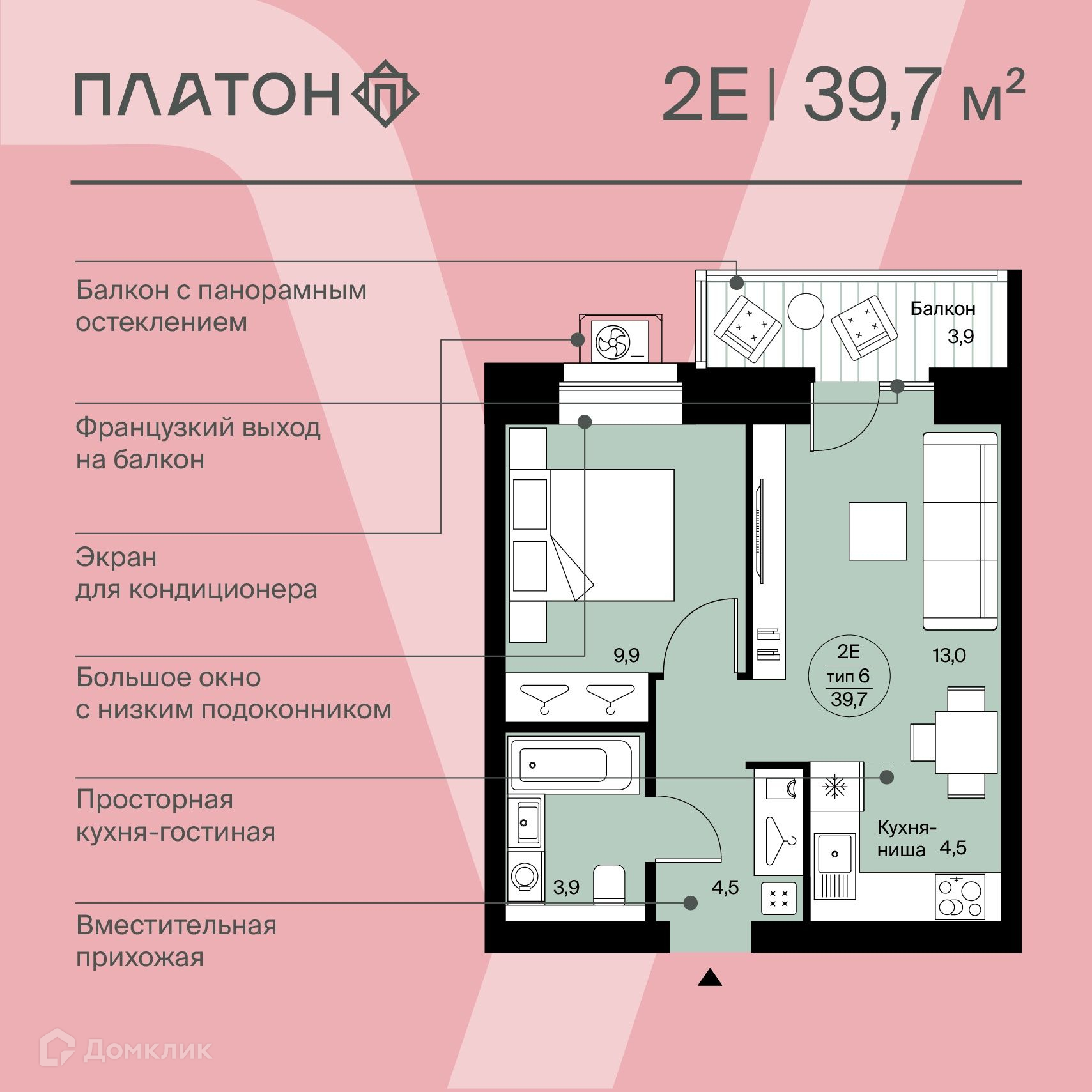 В квартире просторная кухня-гостиная с выходом на панорамный балкон, где можно организовать дополнительную полезную площадь, спальня, совмещенный санузел.