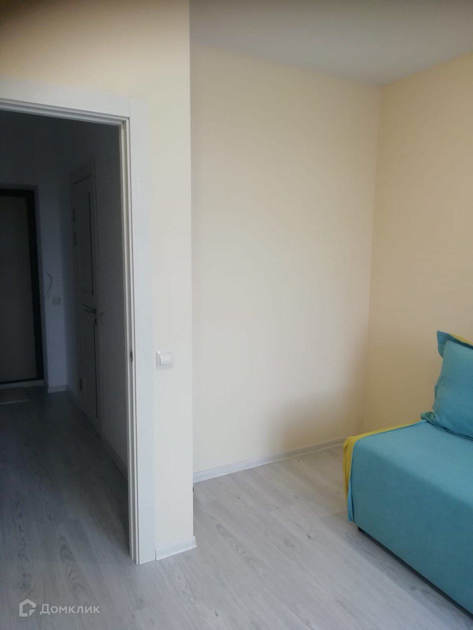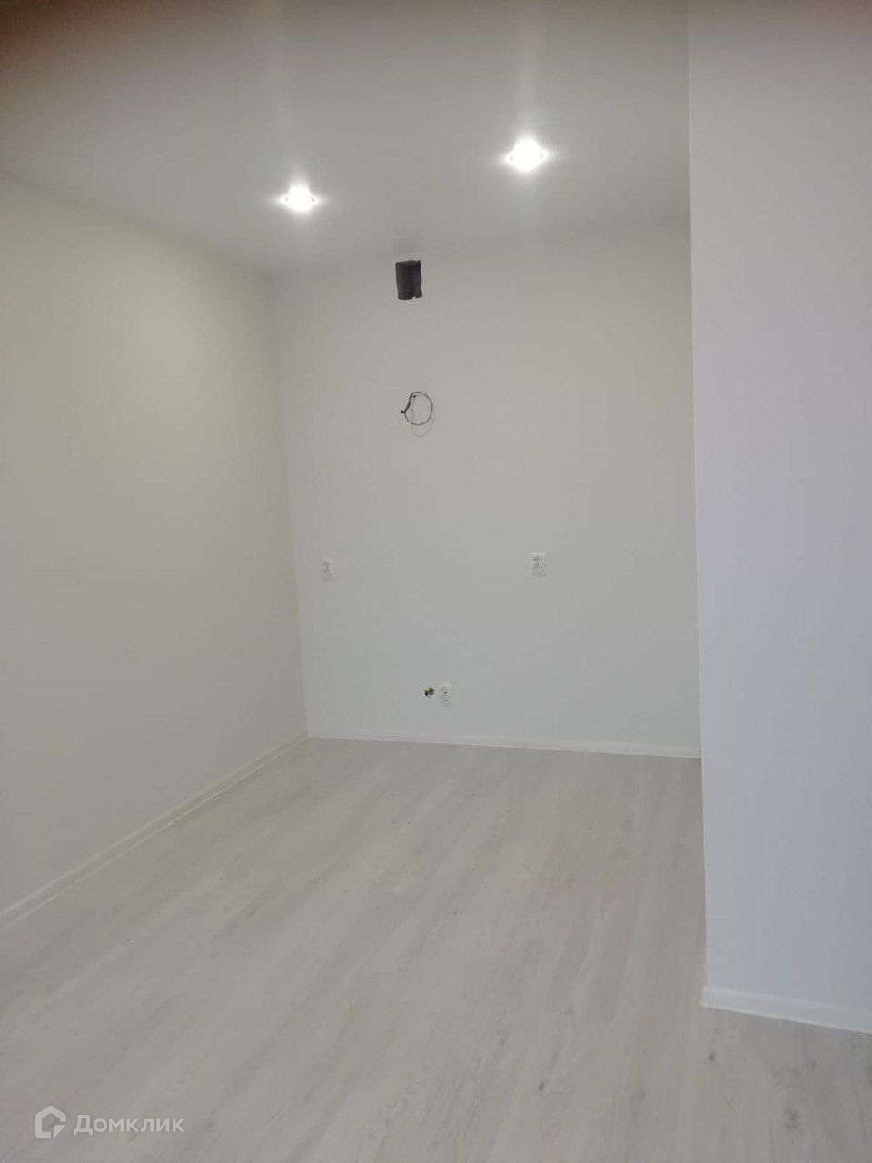 На полу ламинат, натяжные потолки, точечные светильники.
