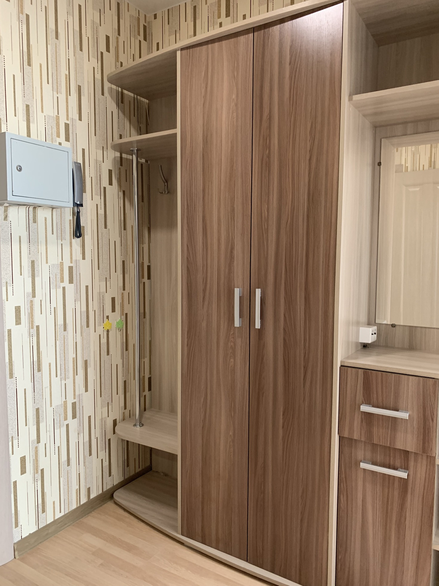В квартире выполнен хороший ремонт. В квартире встроенная кухня с качественной фурнитурой, стенка в прихожей, вместительные шкафы купе в спальной и на лоджии.