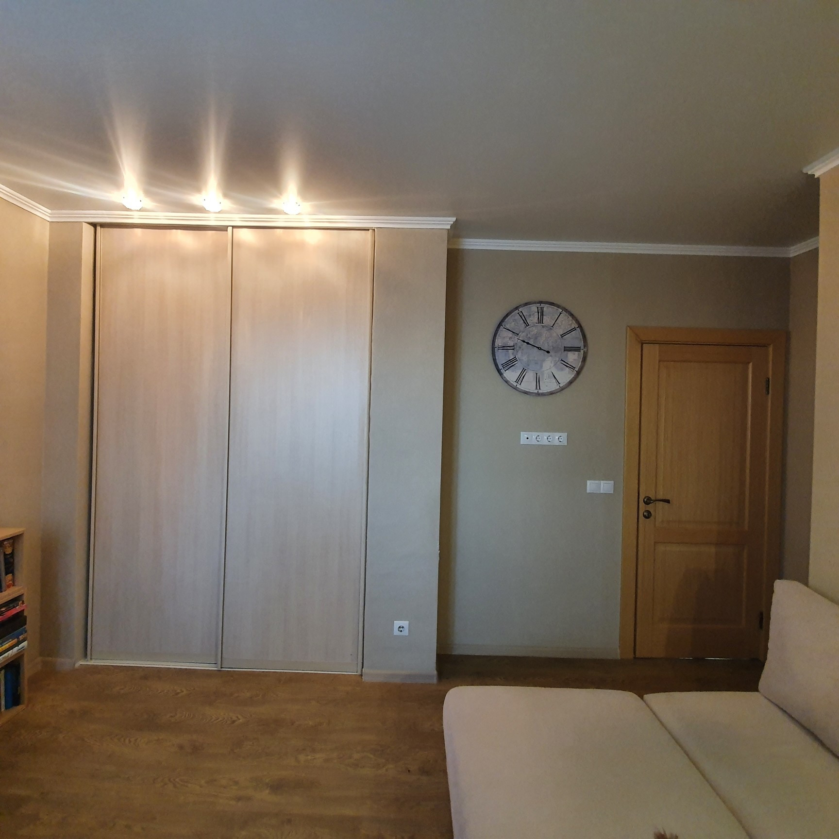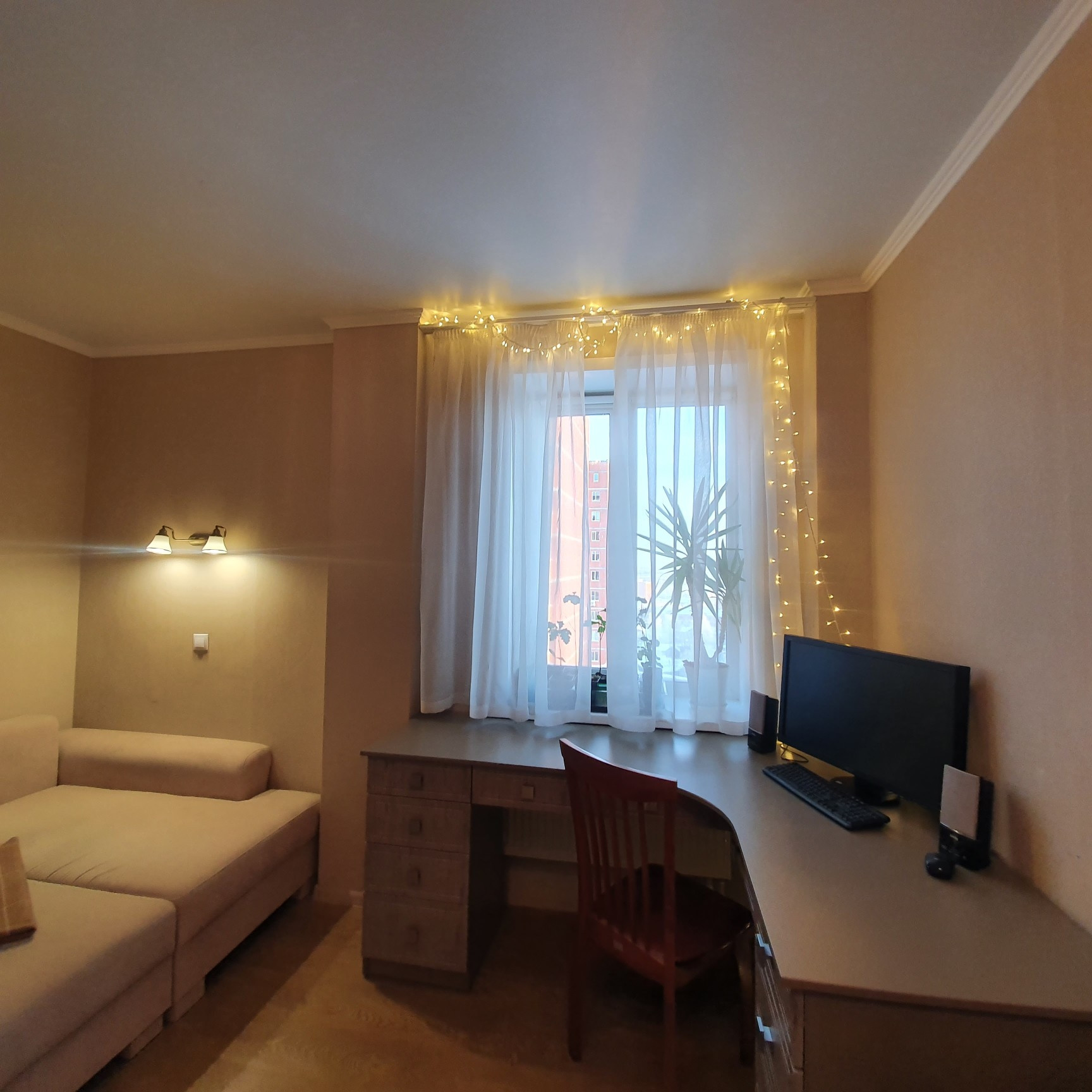 Гостиная: диван, кресло, оборудованное рабочее место под компьютер и принтер, вместительная гардеробная.